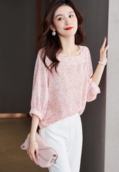 レディース トップス シャツ ブラウス プルオーバー 7分袖 スクエアネック かわいい 大人可愛い カジュアル おしゃれ 存在感 総柄 夏 普段使い M L XL 2XL ブラック ピンク