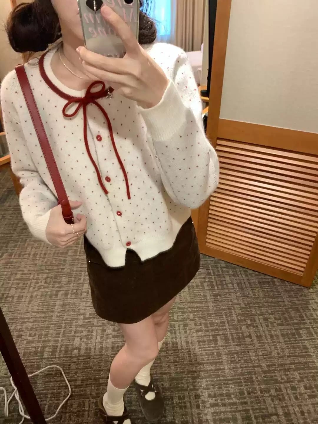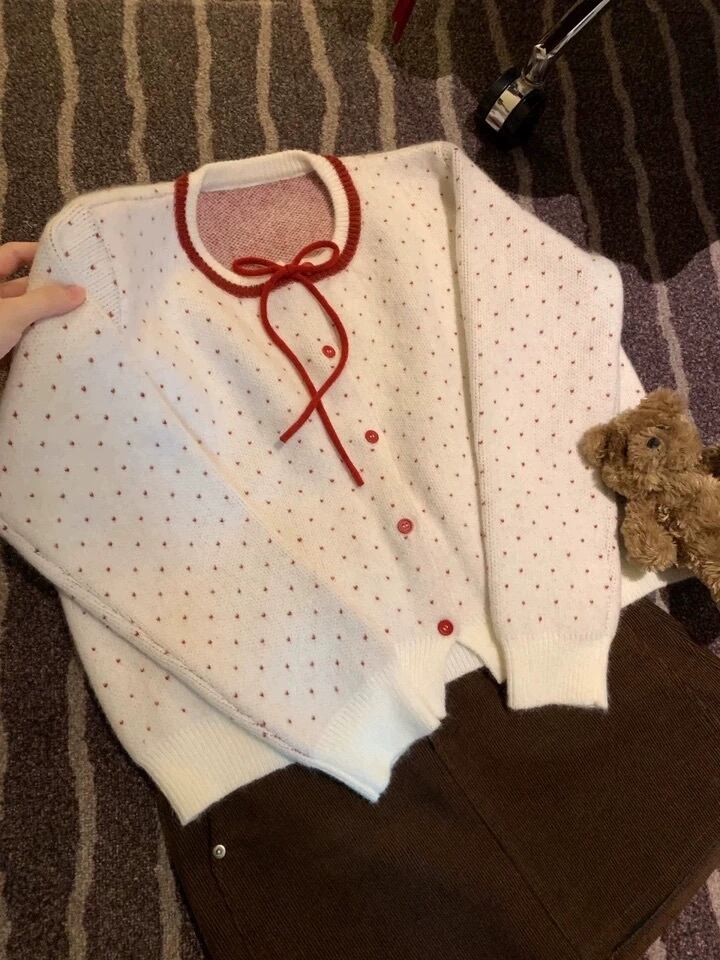 トップス ニット セーター カーディガン 長袖 ラウンドネック リボン 前開き ボタン 中厚手 かわいい 上品 ガーリー ラブリー キュート ドット柄 秋 冬 デート お出かけ 女子会 モテ