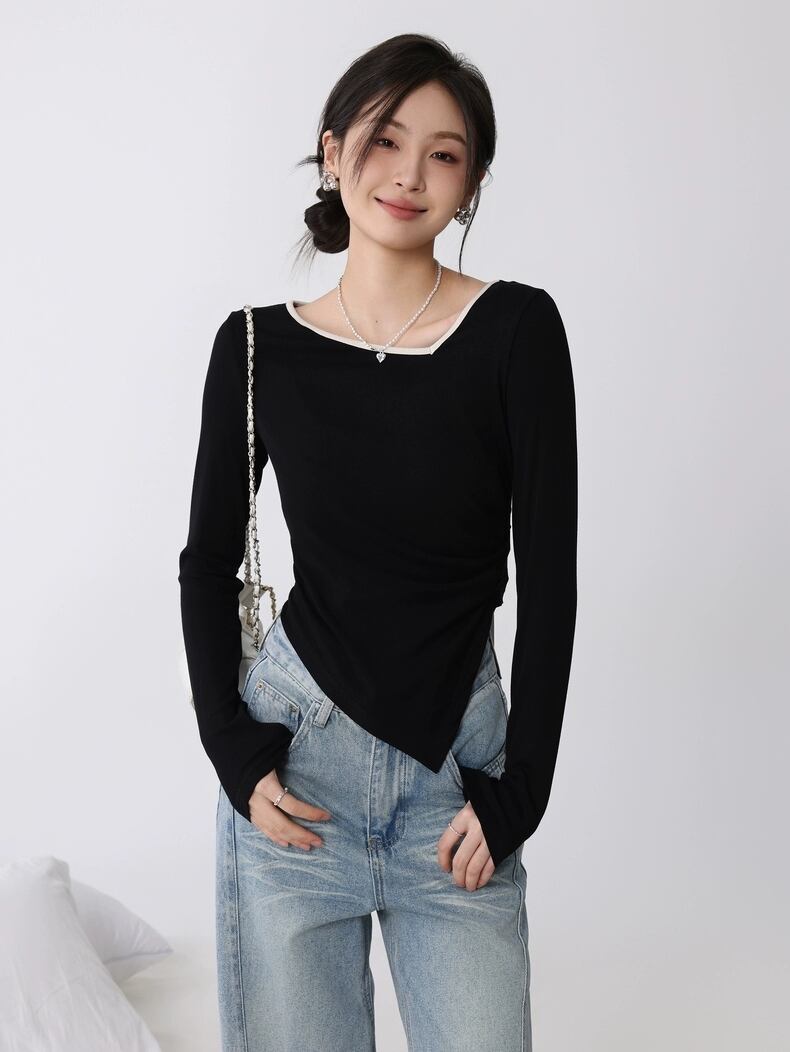 レディース トップス ブラウス 上着 長袖 インナーシャツ 細身 スリム 中厚手 伸縮性 個性的 カジュアル かわいい 大人可愛い シンプル おしゃれ 無地 春 秋 冬 暖かい 通勤 デート 旅行 黒