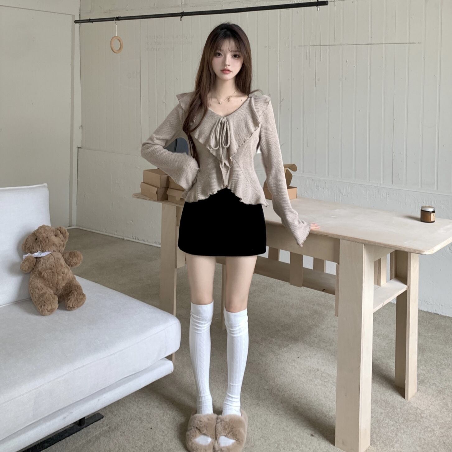 フレアスリーブとフリルVネックのデザインが魅力的で、アシンメトリーなシルエットが洗練された印象を与えます。フリルとリボンが施されたこのニットは、秋の通勤やデート、お出かけにぴったりの一着です。