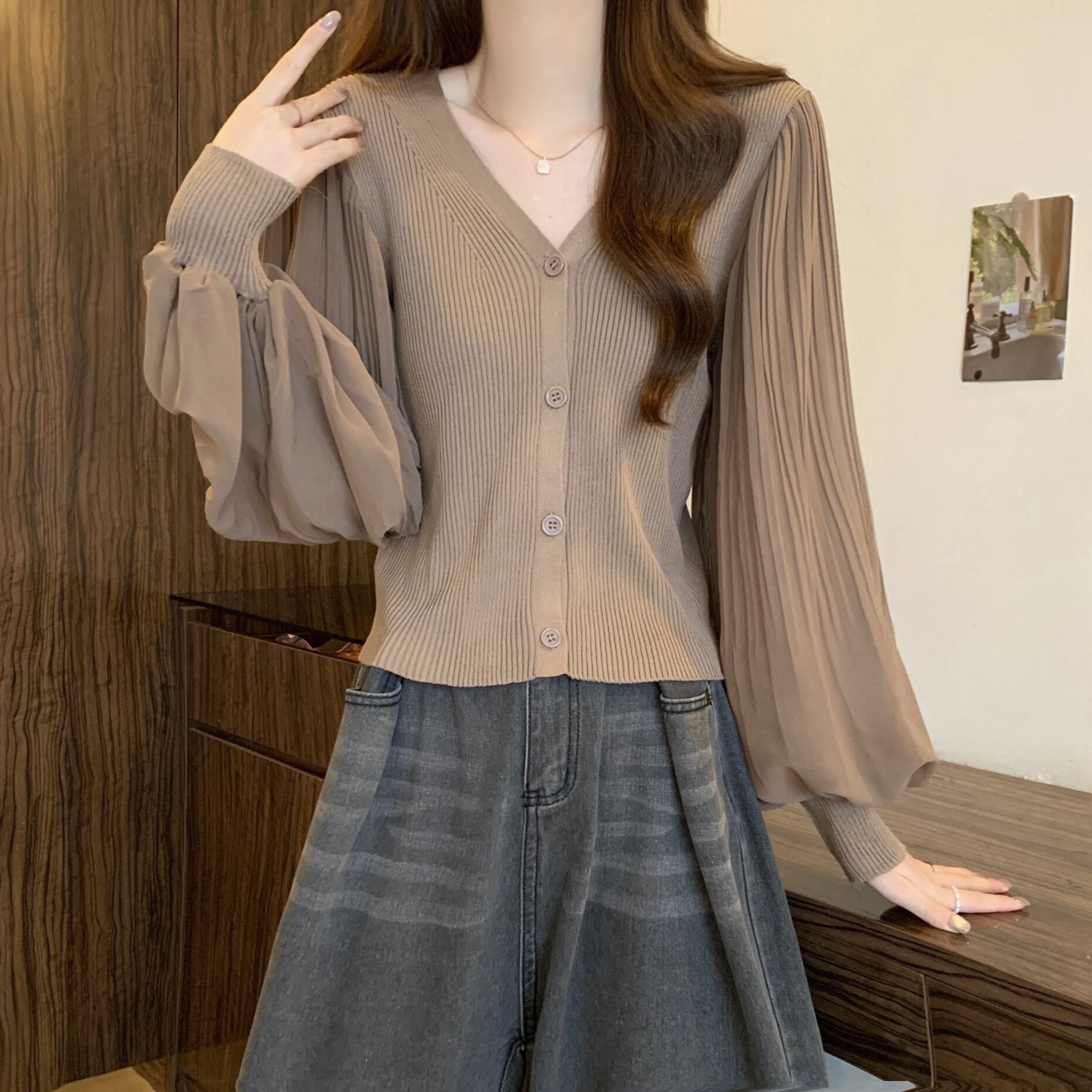 レディース トップス ボリューム袖 バルーン袖 Vネック スリム 細身 プリーツ シフォン 前開き リブニット 透け感 切り替えデザイン 大人可愛い きれいめ 上品 おしゃれ とろみ感 抜け感 秋 OL 通勤 デート お出かけ 韓国 体型カバー 普段使い