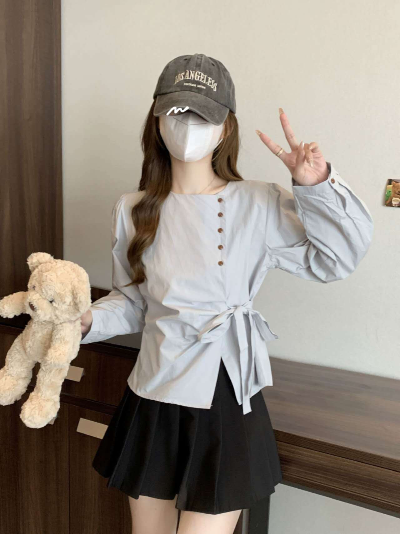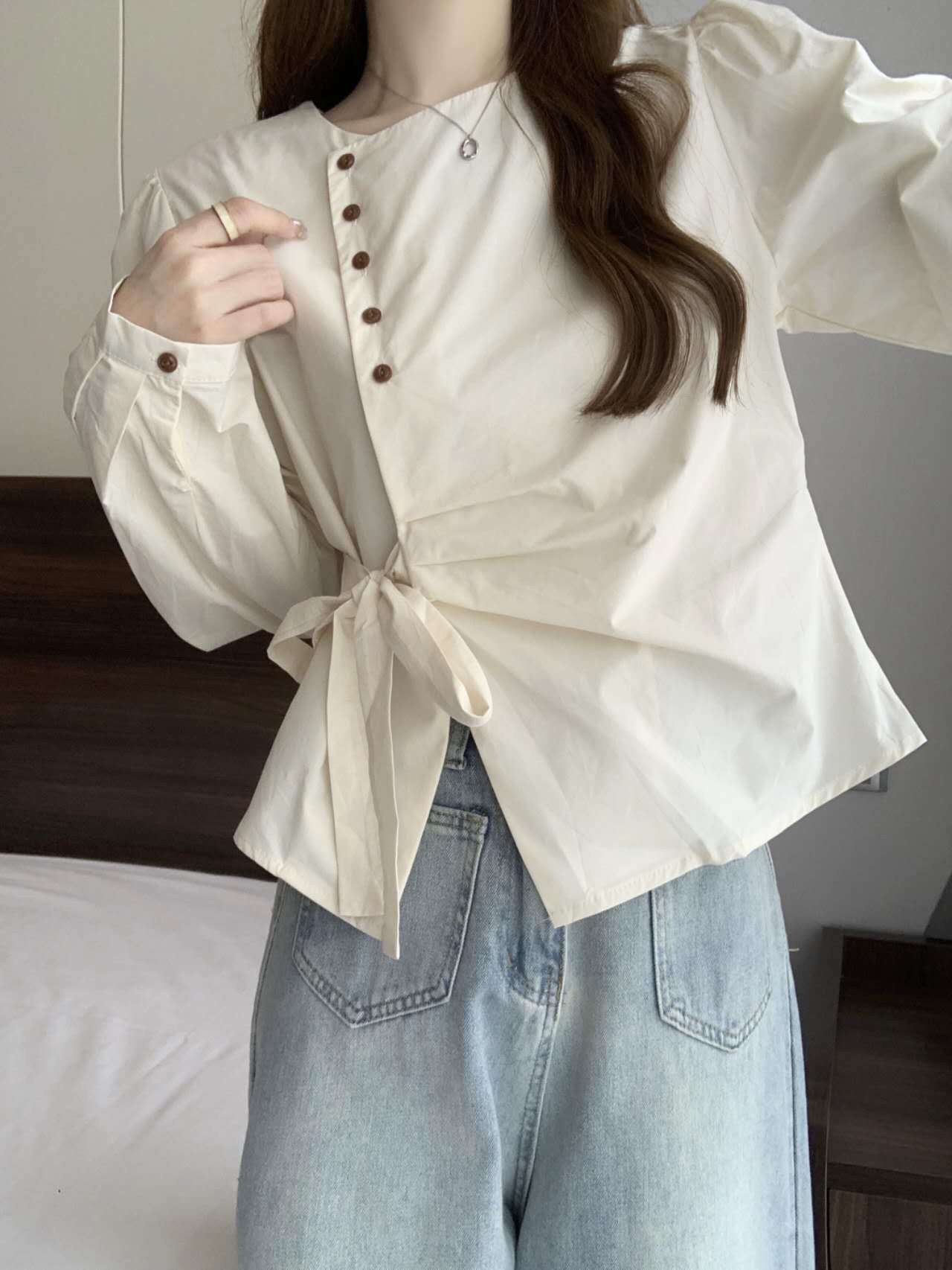 レディース トップス シャツ ブラウス 長袖 ラウンドネック 細身 薄手 ワイド 大人可愛い きれいめ シンプル 上品 おしゃれ 無地 春 秋 通勤 通学 デート お出かけ トレンド 流行