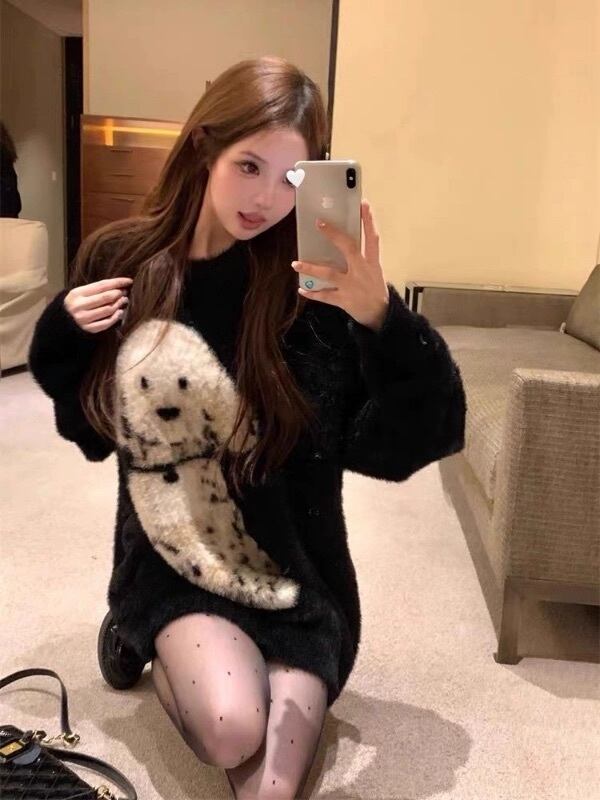 レディース トップス セーター 長袖 ラウンドネック もこもこ 中厚手 かわいい 大人可愛い カジュアル ガーリー キュート 犬 ドッグ 秋 冬 学生 通学 お出かけ 普段使い