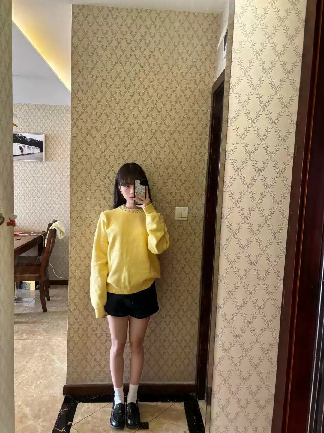 レディース トップス セーター 長袖 ラウンドネック ビーズ キラキラ 中厚手 大人可愛い きれいめ 上品 無地 秋 冬 デート お出かけ 女子会 休日 普段使い イエロー