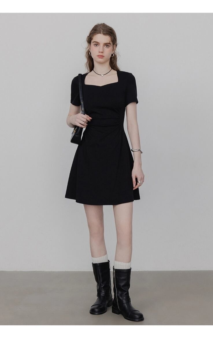 レディース スカート ワンピース ショート 膝上 半袖 スクエアネック スリム 細身 Aライン タック 大人可愛い おしゃれ ポリエステル シンプル 無地 夏 通勤 アイボリー ブラック