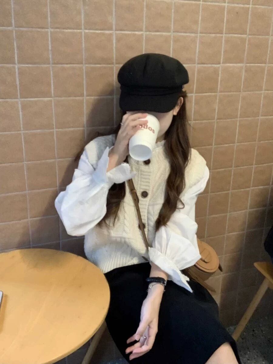 トップス ニット ベスト ウール 袖なし ラウンドネック もこもこ 編み込み ボタン 中厚手 ウール 大人可愛い 上品 学生風 春 秋 オフィス OL 学生 学校 お出かけ 暖かい フリーサイズ グレー オフホワイト