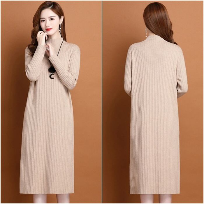 レディース ワンピース ニット 膝下 長袖 ハイネック シンプル 無地 秋 冬 通勤 デート お出かけ お泊まり ショッピング 体型カバー M L XL 2XL 3XL 黒 ブラック グレー ベージュ
