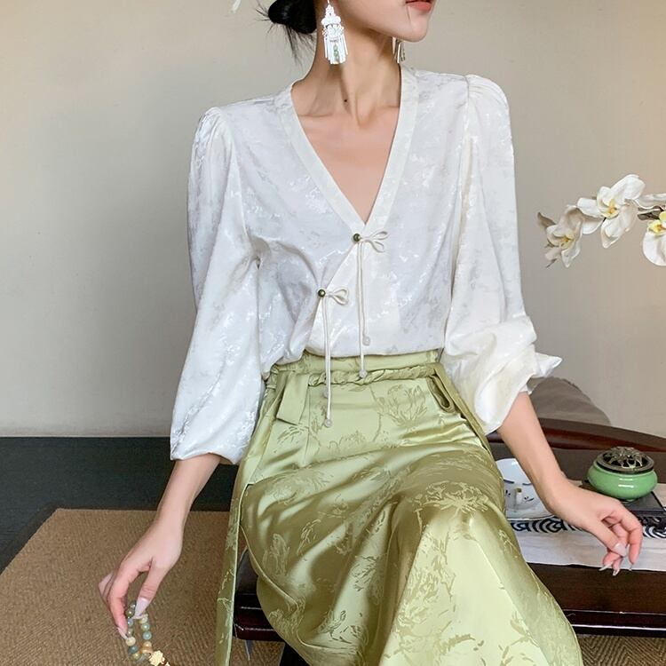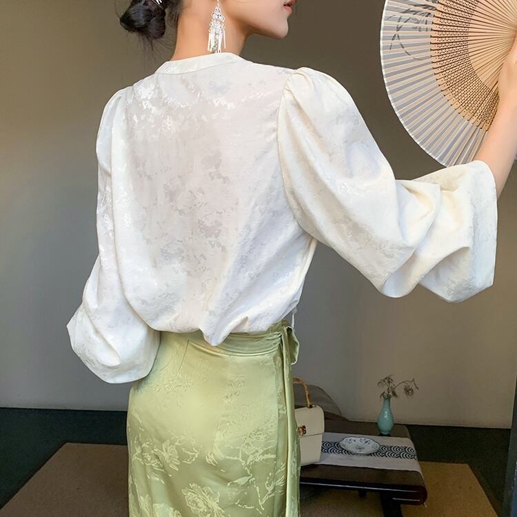 エレガントで上品なデザインが魅力の長袖パフスリーブブラウス。Vネックがデコルテを美しく見せ、フェミニンさを引き立てます。オフホワイトの清楚な色合いに、アジアンテイストのエキゾチックなデザインがアクセントとなり、シンプルながらも印象的な一着です。春や秋のお出かけやデート、旅行、リゾートシーンにぴったりで、どんな場所でも華やかさをプラスしてくれます。