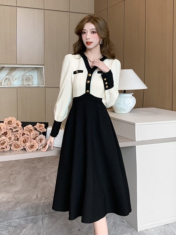 大人可愛い仕上がりのワンピースが登場です!膝下のミモレ丈、長袖パフスリーブ、そしてVネックが魅力を引き立てます。スリムなAラインシルエットは、体型をしっかりとカバーしながらも、上品でエレガントな印象を与えてくれます。また、ハイウエストデザインにより脚長効果も実現!デートやお出かけ、秋冬のシーンに活躍間違いなしの一着です。