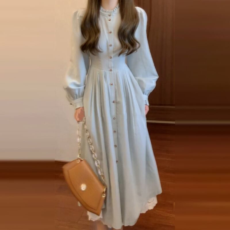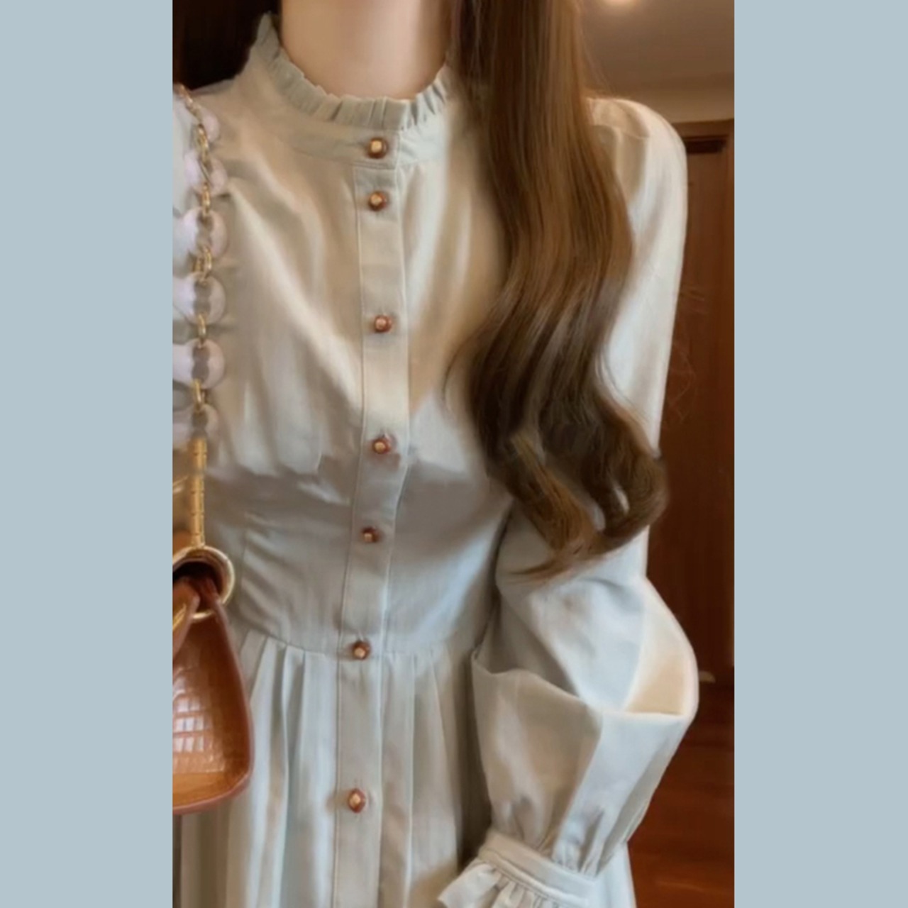 大人可愛いロングワンピースが登場です!長袖のパフスリーブとフリルスタンドカラーが、上品でエレガントな印象を与えてくれます。スリムなAラインシルエットは体型をカバーしつつ、ハイウエストデザインが脚長効果を実現します。春や秋のお出かけ、デートにぴったりな一着です。