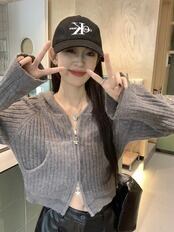 レディース トップス ニット パーカー 前開き ショート 長袖 サイドボタン ファスナー 前開き 大人可愛い おしゃれ かっこいい 都会的 無地 春 秋 冬 重ね着 韓国 コーデ 普段使い 着回し グレー