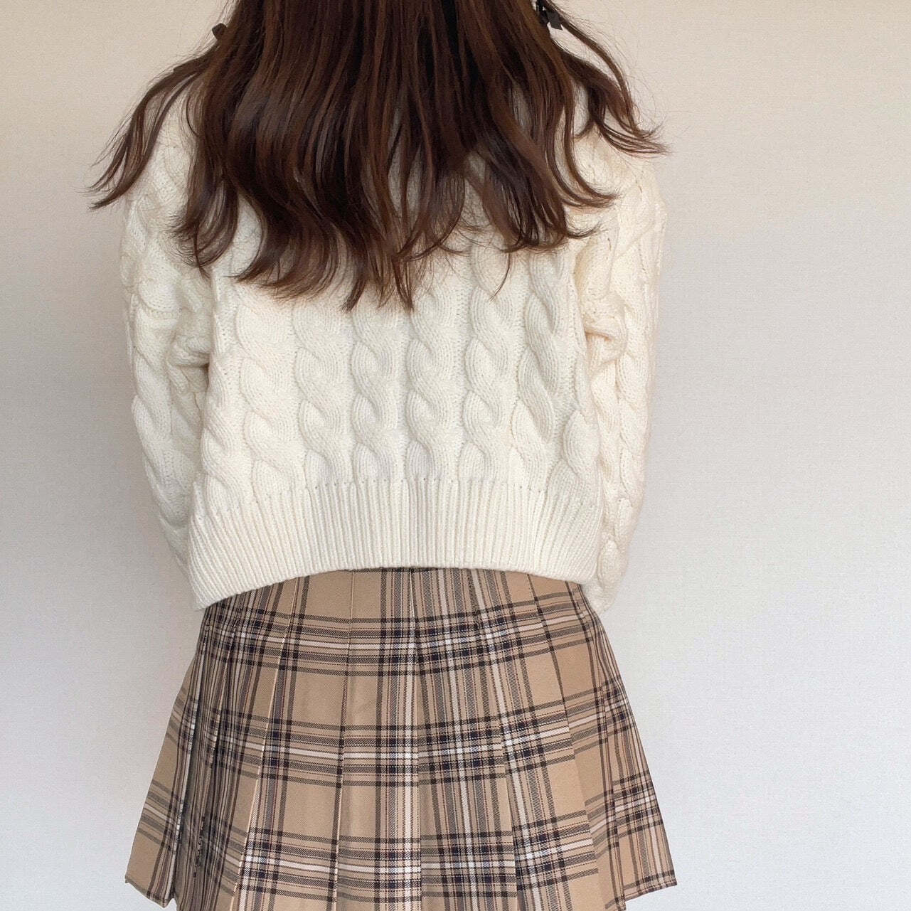 レディース トップス ニット セーター ショート 長袖 ラウンドネック 編み込み バイカラー かわいい 大人可愛い カジュアル おしゃれ ラフ 抜け感 ロゴ 秋 冬 韓国 楽ちん 暖かい 防寒 普段使い 着回し