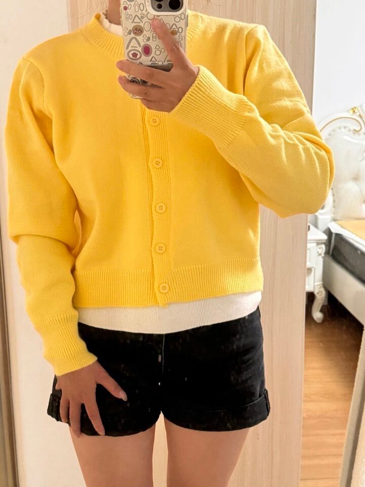 レディース トップス セーター カーディガン 長袖 ラウンドネック タイト スリム 中厚手 きれいめ シンプル カジュアル 無地 秋 冬 お出かけ 公園 休日 普段使い 着回し 黄色