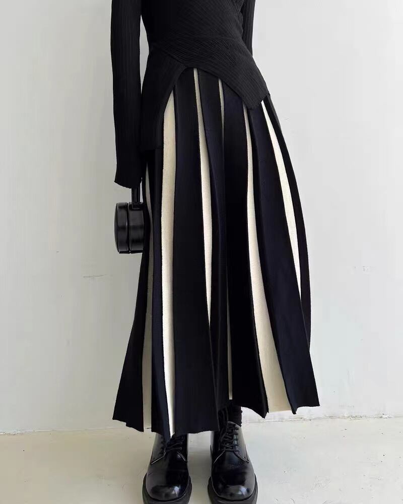 レディース スカート フレアスカート ロングスカート 膝下 Aライン 切り替え フェミニン プリーツ ハイウエスト バイカラー 配色 中厚手 大人可愛い きれいめ レトロ 個性的 モード系 無地 秋 冬