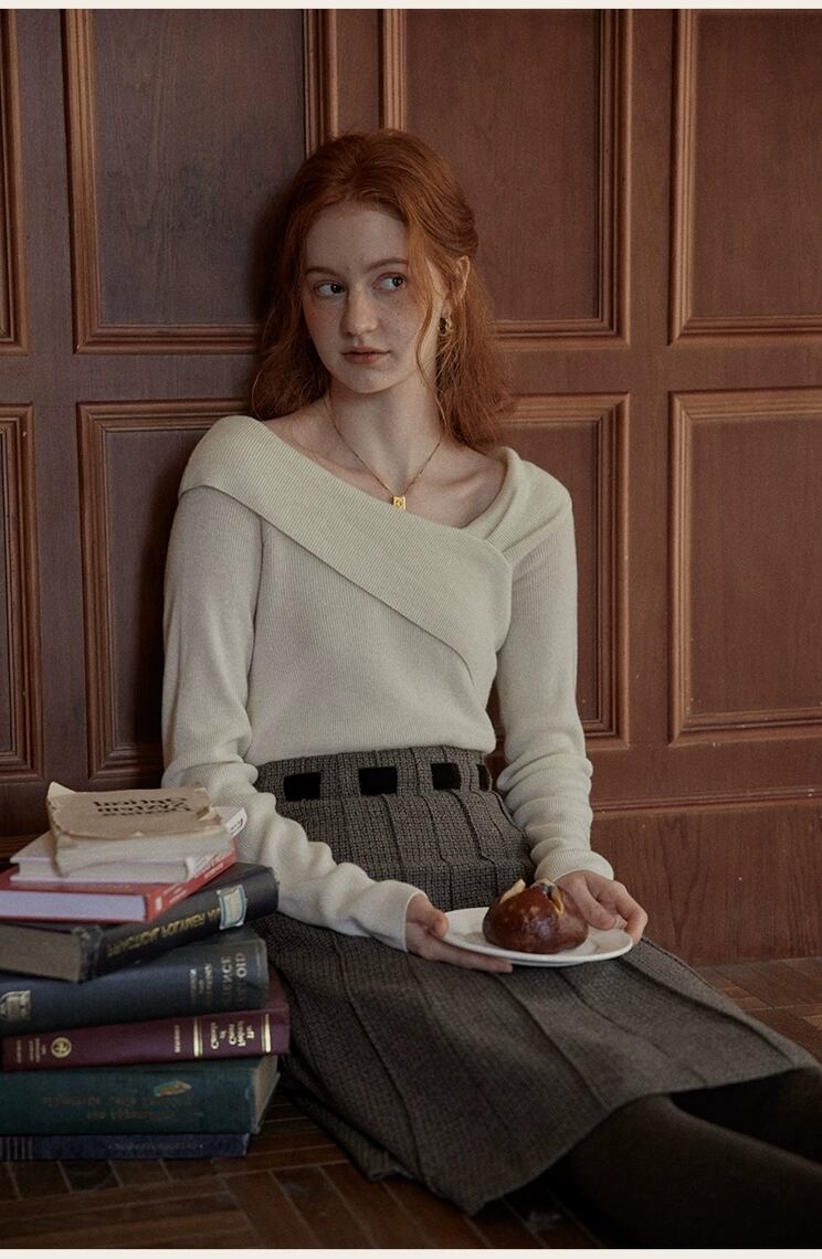 レディース トップス ニット セーター 長袖 Vネック オフショルダー スリム 細身 中厚手 大人可愛い きれいめ レトロ 無地 秋 冬 デート フィット感 ふんわり シンプル ホワイト ダークグレー