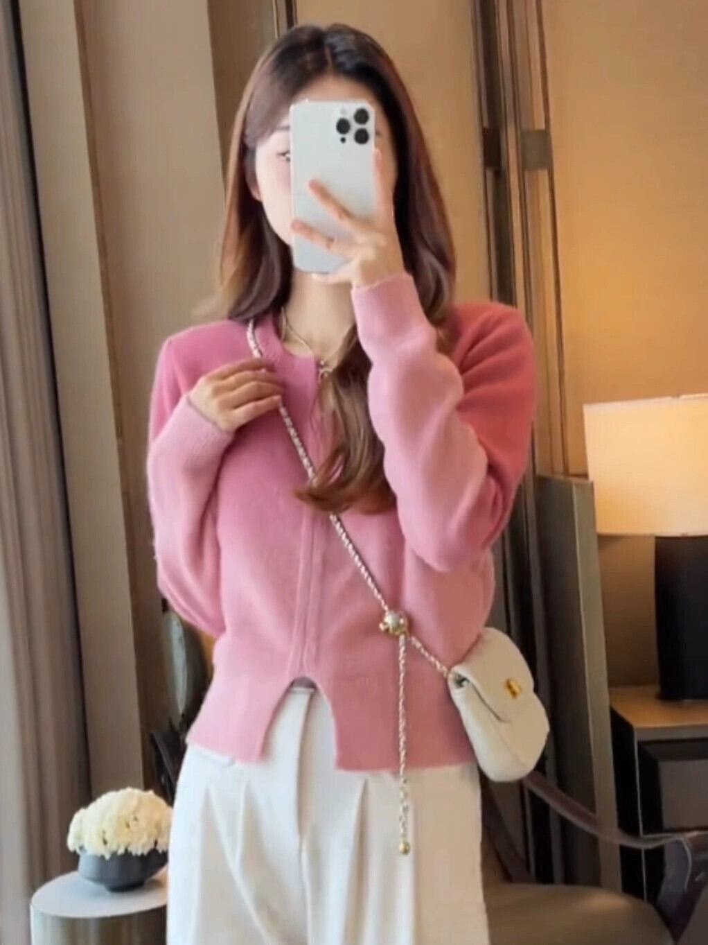 レディース カットソー ニット セーター ショート 長袖 ファスナー かわいい 大人可愛い おしゃれ こなれ感 無地 春 秋 冬 デート 女子会 韓国 コーデ 普段使い 着回し モテ ピンク