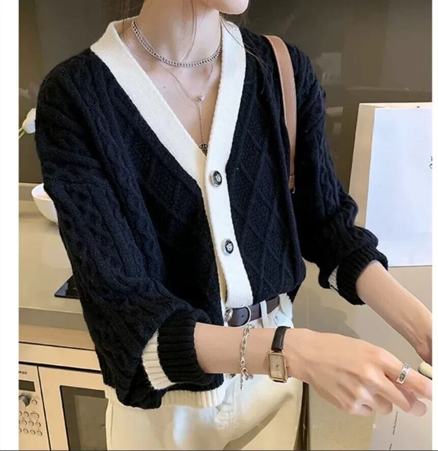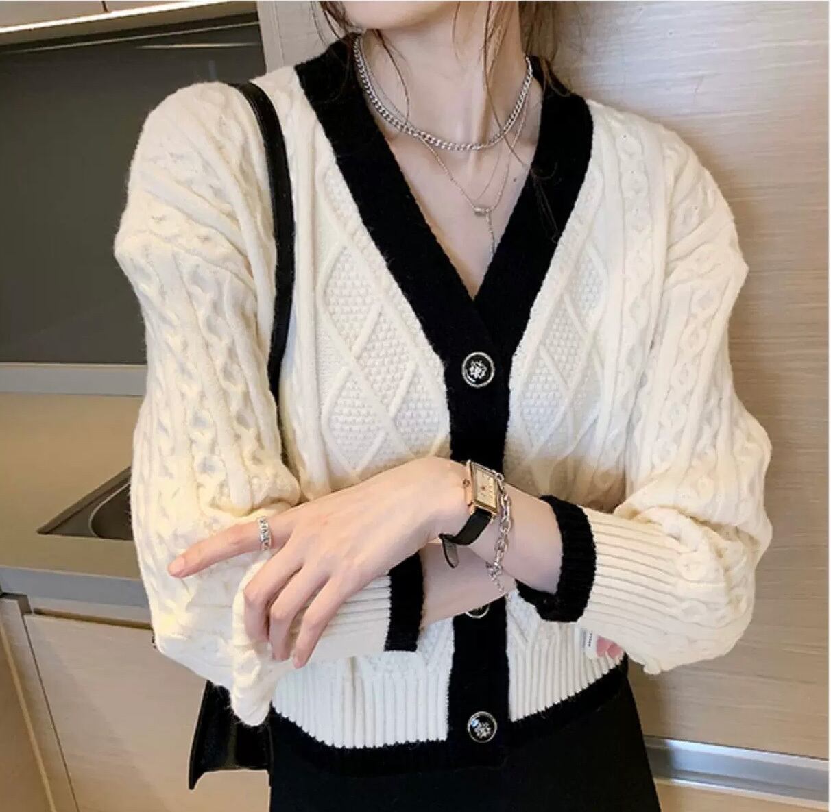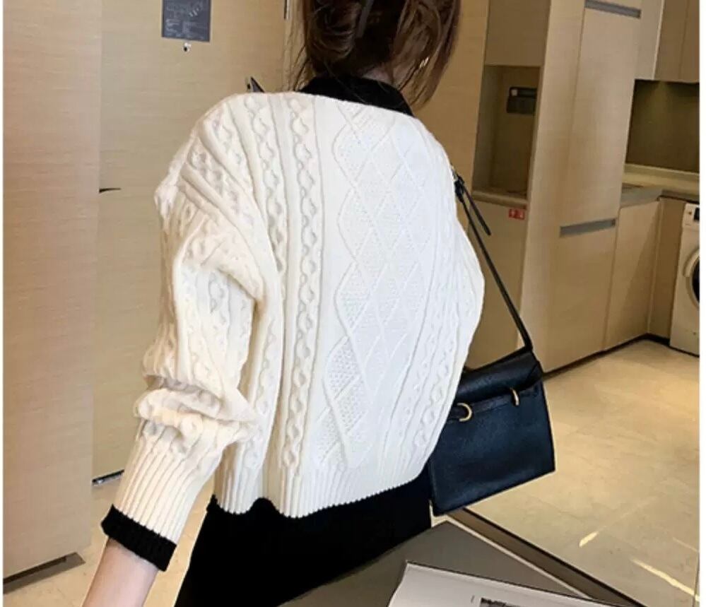レディース トップス ジャケット ニット セーター カーディガン 長袖 Vネック ストレート ケーブルニット 配色 ウール きれいめ 上品 無地 秋 冬 オフィス OL お出かけ ブラック オフホワイト