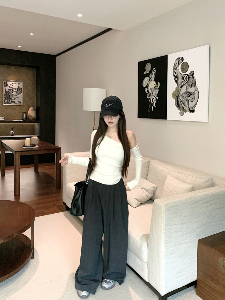 レディース トップス カットソー ニット 長袖 ワンショルダー アシンメトリー 大人可愛い おしゃれ かっこいい こなれ感 抜け感 都会的 無地 春 秋 冬 デート 女子会 韓国 コーデ 普段使い 着回し モテ