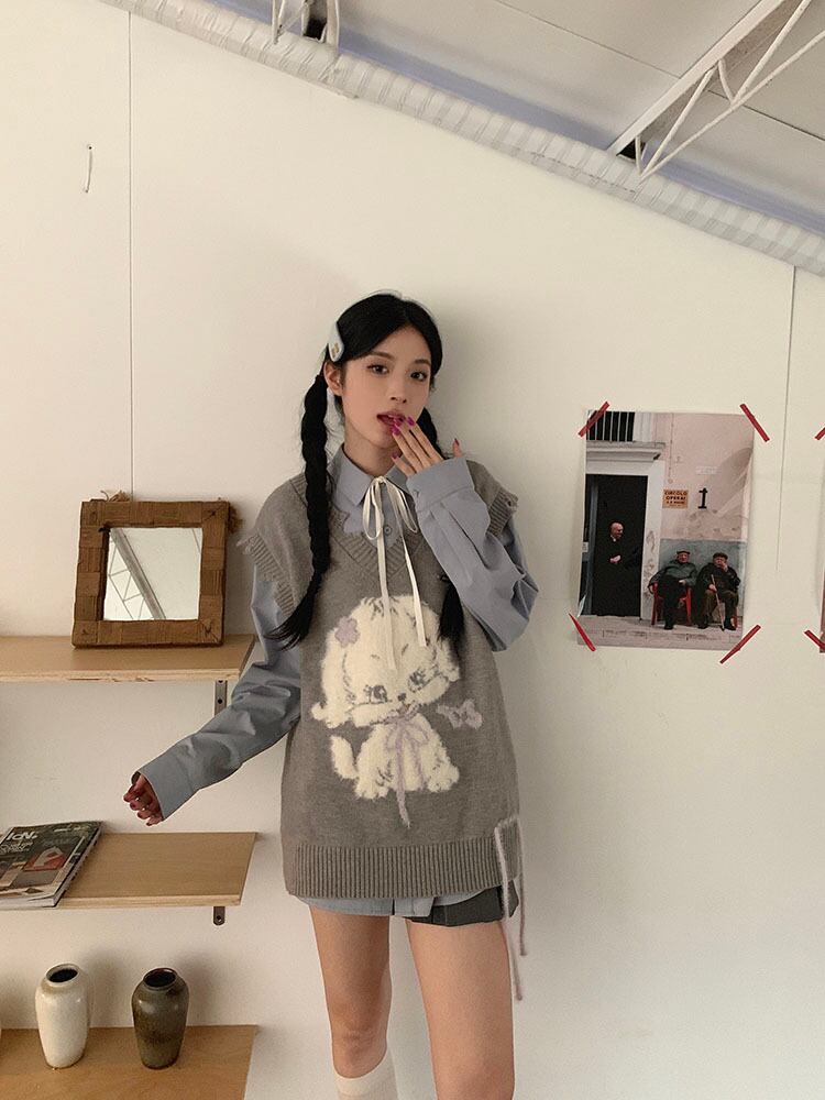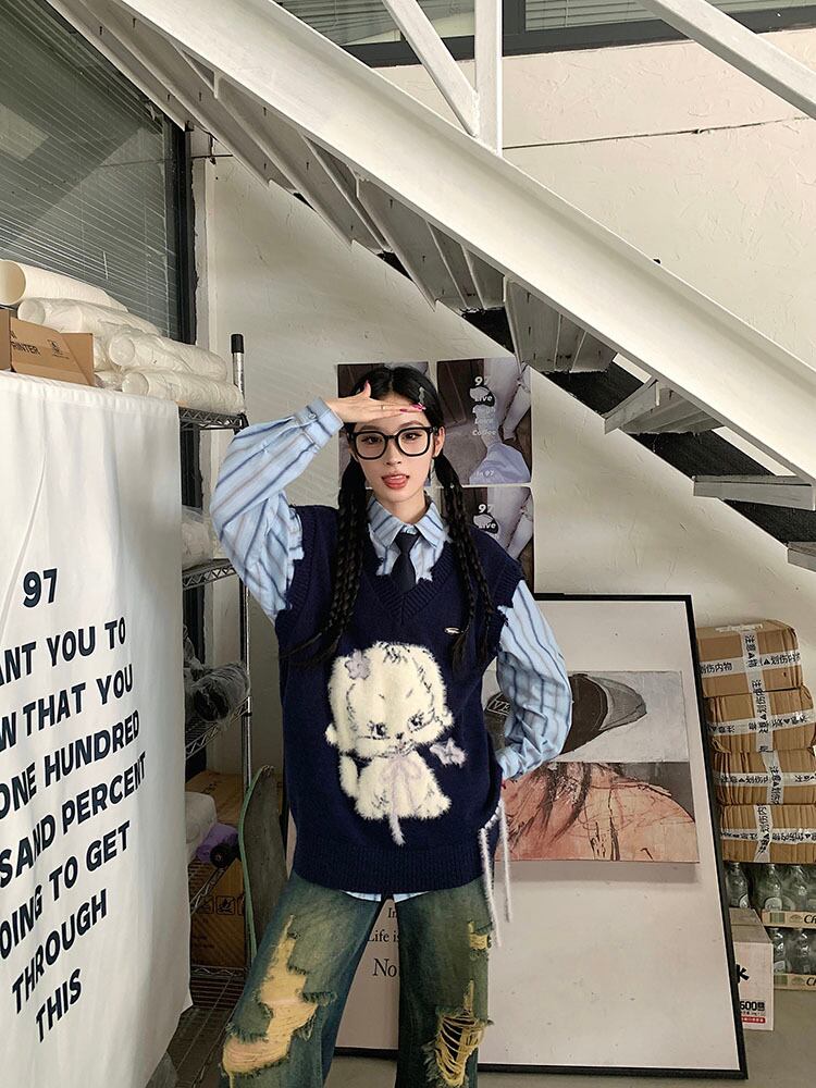 レディース トップス ニット セーター 丈長 袖なし ノースリーブ Vネック ワイド オーバーサイズ 伸縮性 ストレッチ かわいい ガーリー ルーズ 存在感 ラブリー キュート アメリカン プレッピー アニマル柄 キャラクター