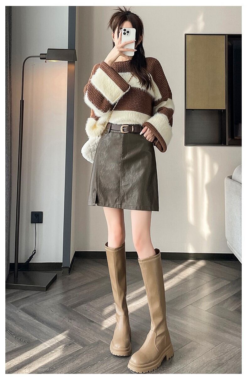 レディース ボトムス ショートスカート 膝上 Aライン ベルト ポケット ハイウエスト PUレザー サイドスリット 大人可愛い カジュアル おしゃれ かっこいい こなれ感 無地 美脚 脚長