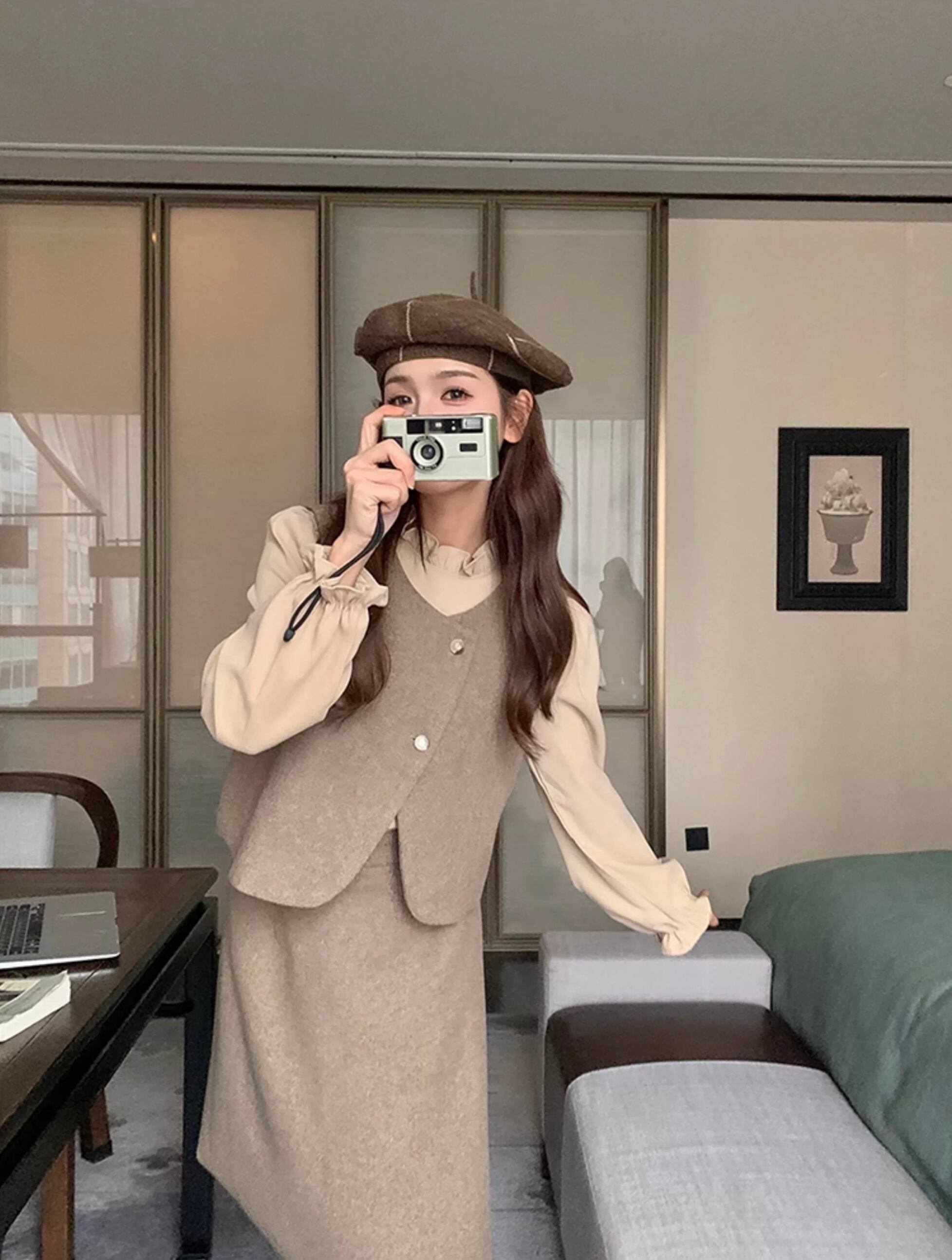 レディース スカート トップス ボトムス ブラウス ベスト セットアップ ミモレ 長袖 パフスリーブ ハイネック 襟付き メロウ Iライン フリル 前開き きれいめ 上品 無地 春 秋 コーデ ベージュ