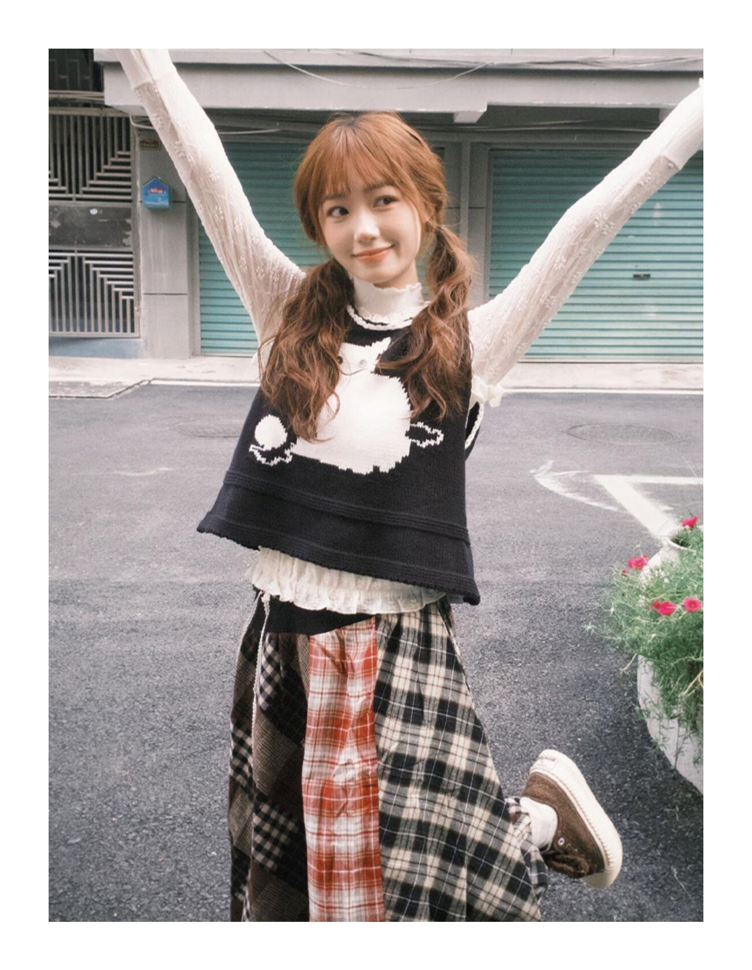 レディース トップス ニット セーター ベスト 袖なし ノースリーブ ラウンドネック バイカラー 配色 伸縮性 かわいい レトロ ガーリー アニマル柄 キャラクター 秋 学生 学校 重ね着 コーデ 楽ちん