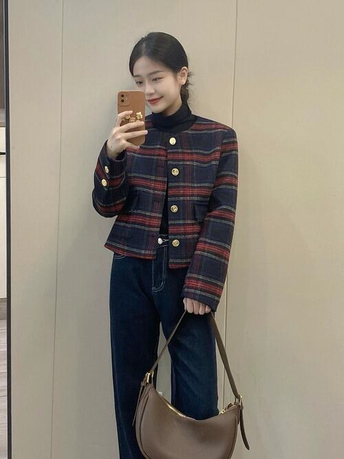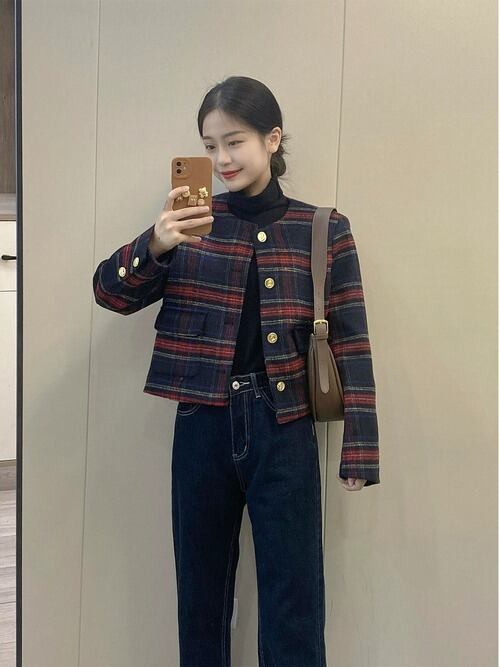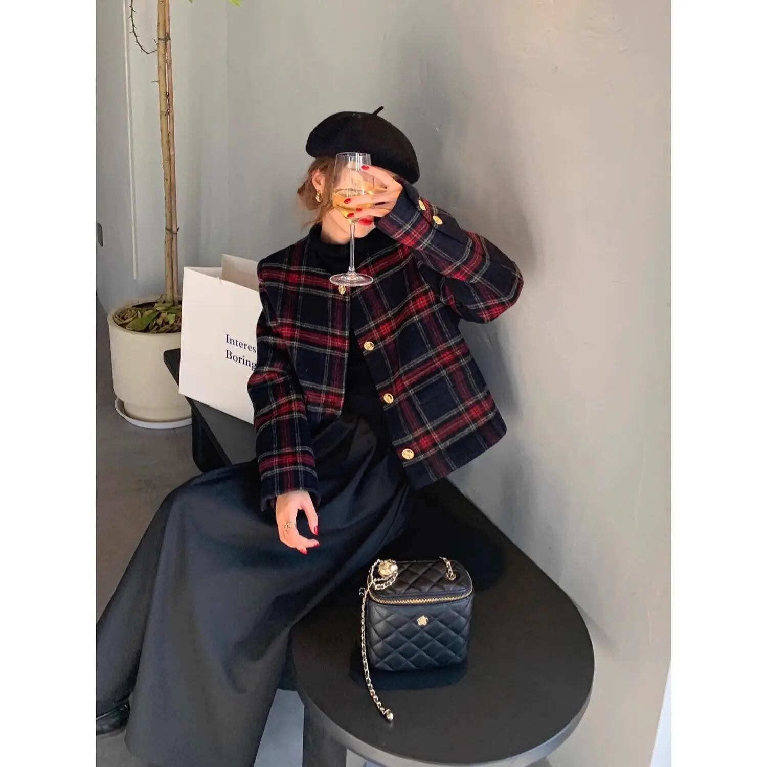 レディース ジャケット 上着 ショート 長袖 ノーカラー 前開き ボタン 大人可愛い おしゃれ かっこいい レトロ こなれ感 個性的 ギンガムチェック 春 秋 冬 韓国 普段使い 着回し トレンド