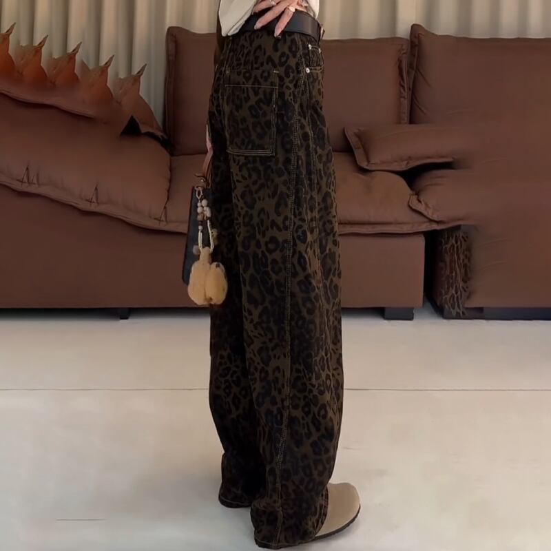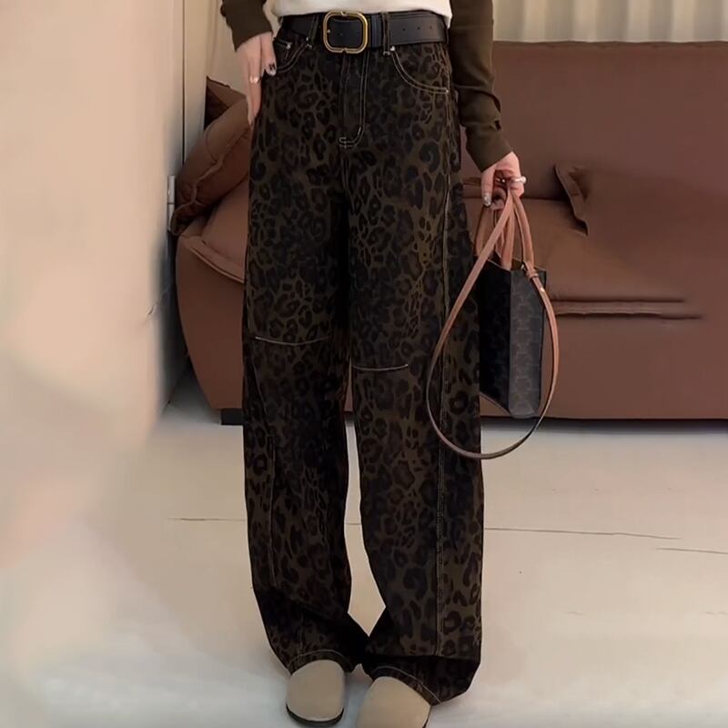 カジュアルでスタイリッシュなレディースデニムストレートパンツの登場です!膝下丈とワイドストレートのシルエットが、あなたのファッションにこなれ感をプラス。中厚手の生地感で、秋の季節にぴったりな一着です。メンズライクなデザインは、ボーイッシュなスタイルが好きな方にもおすすめ。個性的なレオパードアニマル柄が、周囲の視線を引き寄せること間違いなし。このパンツを履けば、毎日のコーディネートがもっと楽しめること間違いなしです!