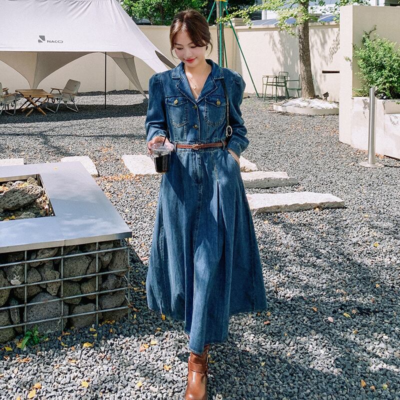 レディース ワンピース デニム ロング 長袖 パフスリーブ Vネック 角襟 Aライン フェミニン ハイウエスト 前開き 異国風 ベルト付き かわいい 大人可愛い きれいめ カジュアル 上品 おしゃれ レトロ 春 秋 OL 通勤 学生 お出かけ 体型カバー