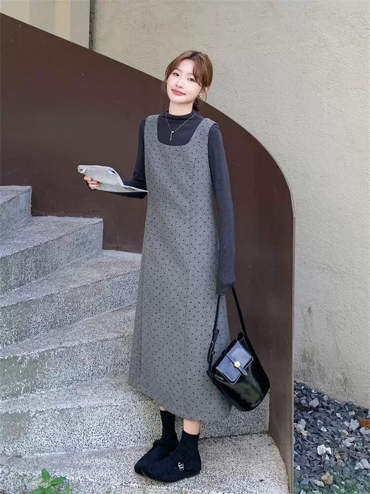 レディース トップス ワンピース セットアップ ジャンパースカート ドレス プルオーバー ミモレ 袖なし 長袖 萌袖 ボトルネック Aライン 大人可愛い シンプル おしゃれ 無地 ドット柄 春 秋 冬