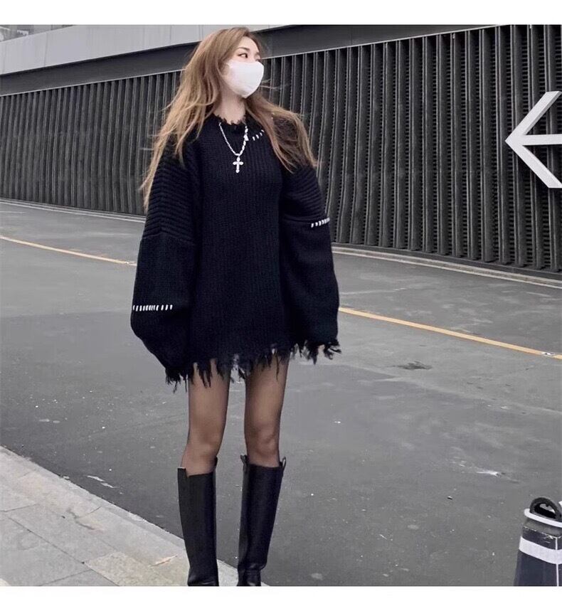 レディース トップス セーター 丈長 長袖 ボリューム袖 ラウンドネック オーバーサイズ 中厚手 フリンジ かっこいい ルーズ クール 抜け感 無地 ステッチ 秋 冬 学生 通学 お出かけ 楽ちん 暖かい