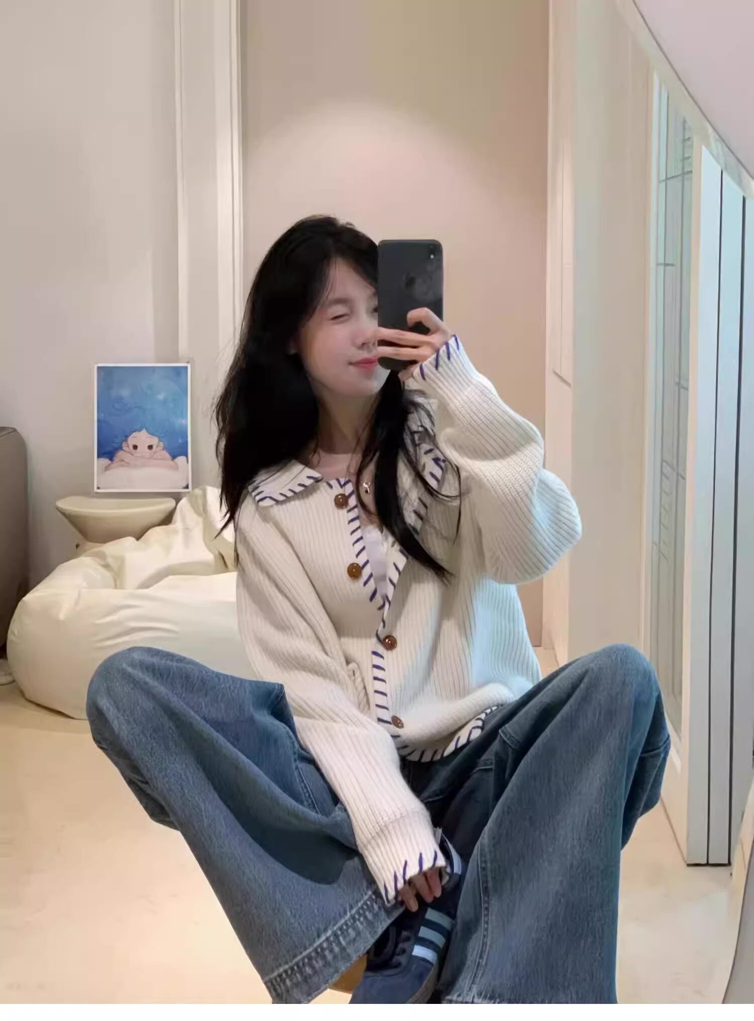 カジュアルでおしゃれなレディーストップス、ニットセーターカーディガンのご紹介です! 襟付きデザインと前開きのボタンが特徴で、薄手タイプなので春や秋の重ね着にぴったり。刺繍のアクセントが個性的さを引き立て、無地でシンプルながらも存在感のある一着です。休日のお出かけやデートにも最適ですので、コーディネートを楽しんでください!