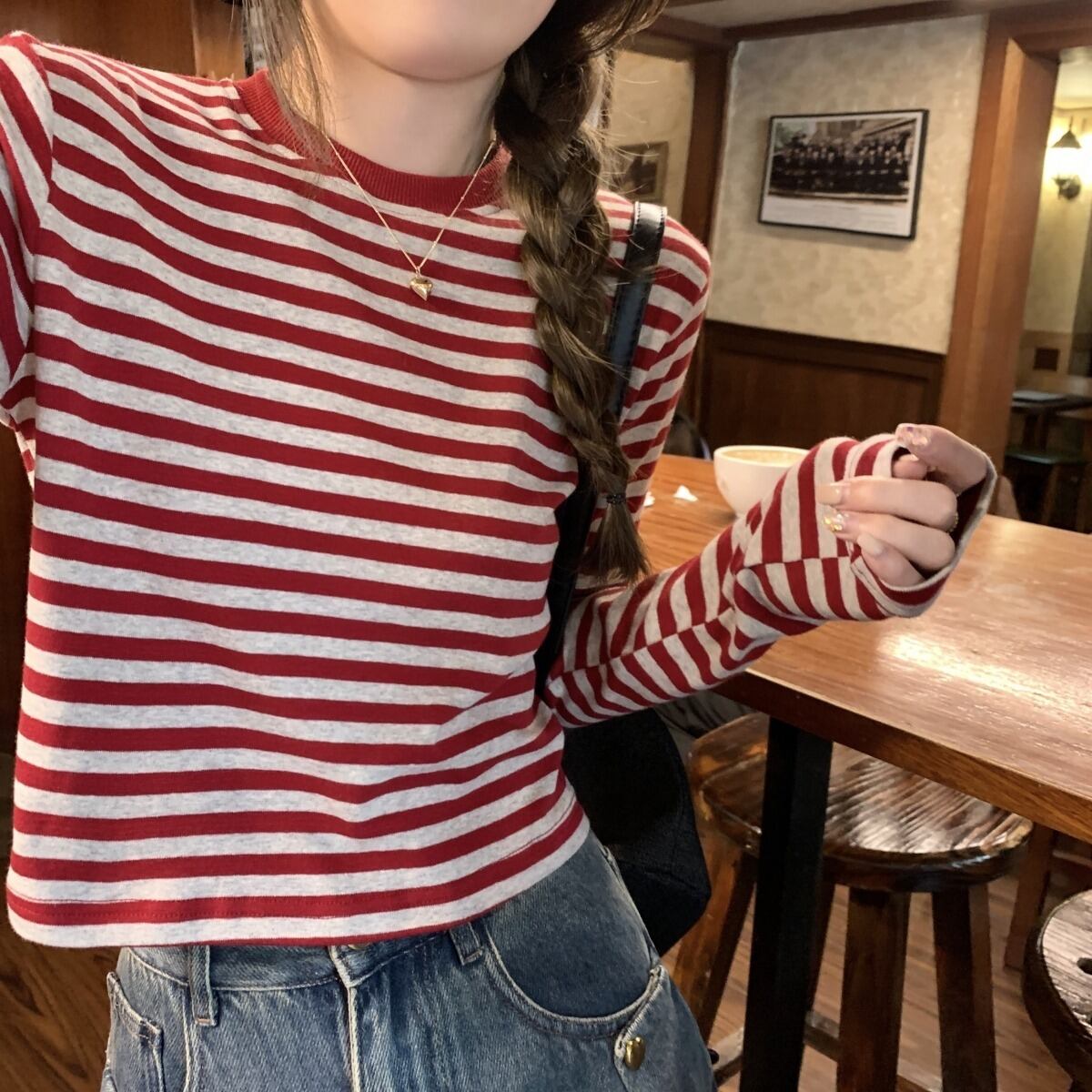 レディース トップス ニット ミニ 長袖 ラウンドネック 細身 薄手 ニット かわいい きれいめ カジュアル ボーダー 学生 韓国 オルチャン トレンド S M L XL 黒 レッド