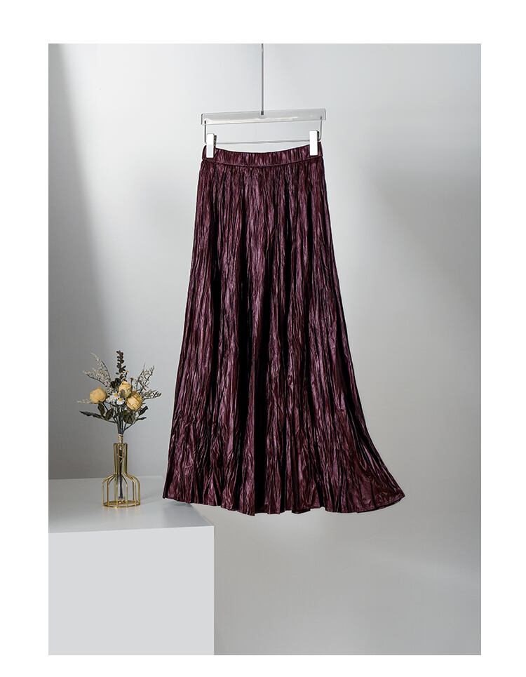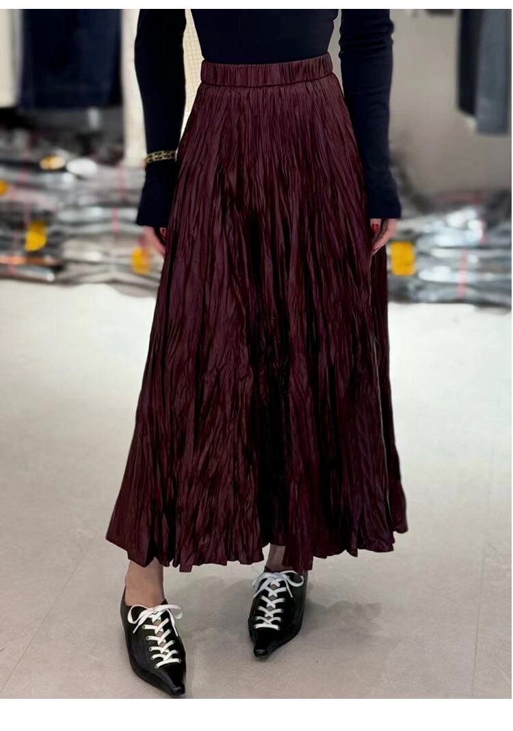 スカート 膝下 ロング Aライン プリーツ 光沢 きれいめ 上品 おしゃれ かっこいい レトロ エレガント 無地 通勤 イベント レストラン ホテル モテ S M L XL 黒 ブラウン ワインレッド