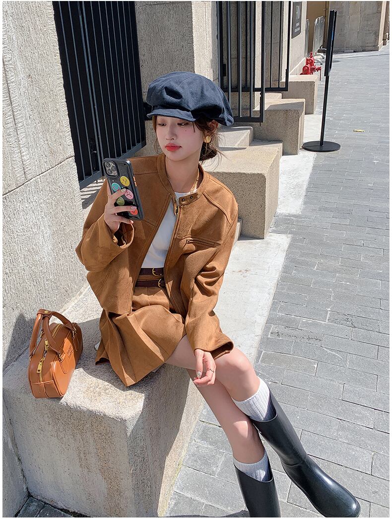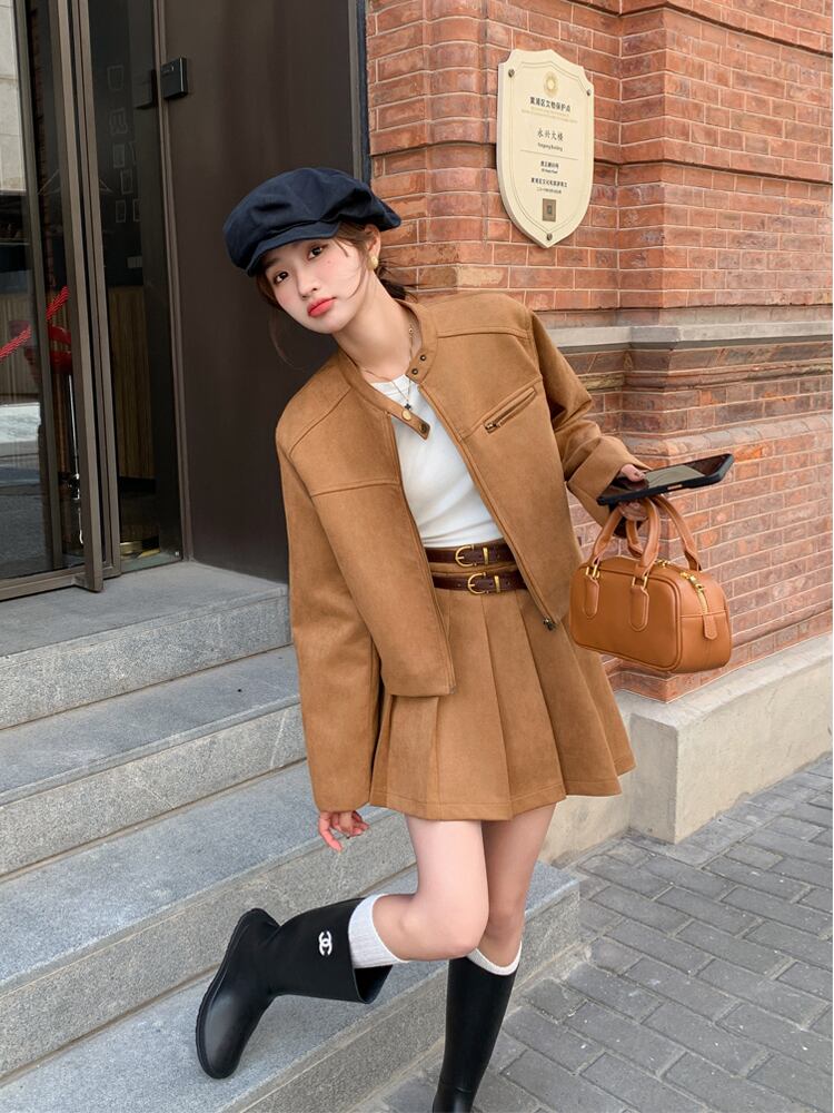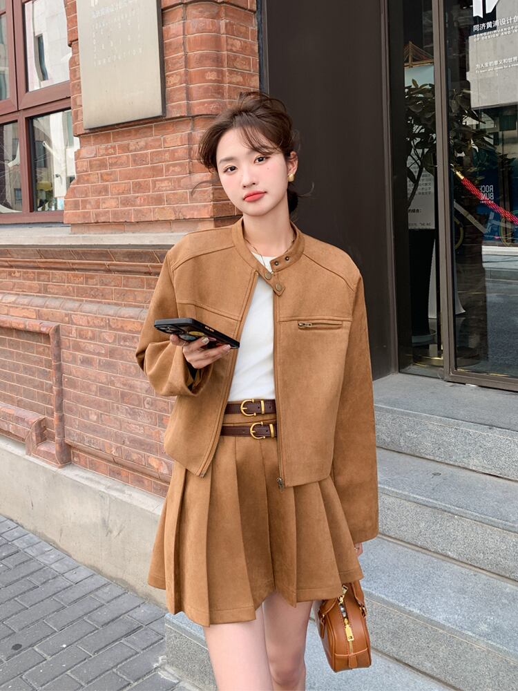 レディース スカート ジャケット ボトムス セットアップ アウター 2点セット ミニ 長袖 プリーツ ファスナー 前開き かわいい 大人可愛い おしゃれ 無地 お出かけ ショッピング