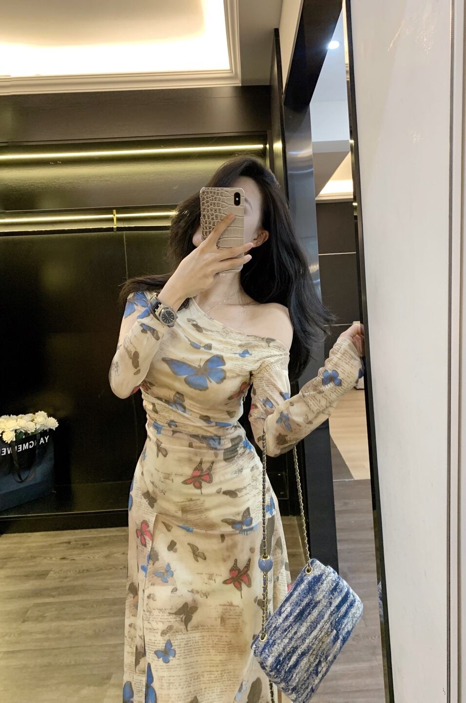 この洗練されたレトロ蝶々プリントワンピースは、秋にぴったりな膝下ロング丈で、長袖・ワンショルデザインが魅力的です!スレンダーなタイトシルエットが女性らしいラインを強調し、フレアの細身Iラインが美しい印象を与えます。襟なしのデザインは、上品でエレガントな雰囲気を醸し出し、特別なイベントや華やかなシーンで主役級の存在感を発揮します!