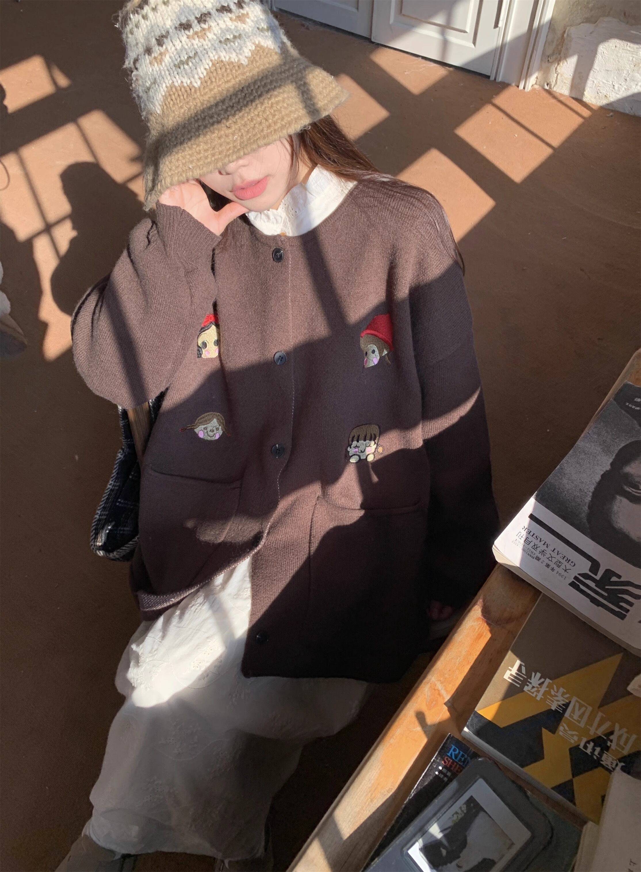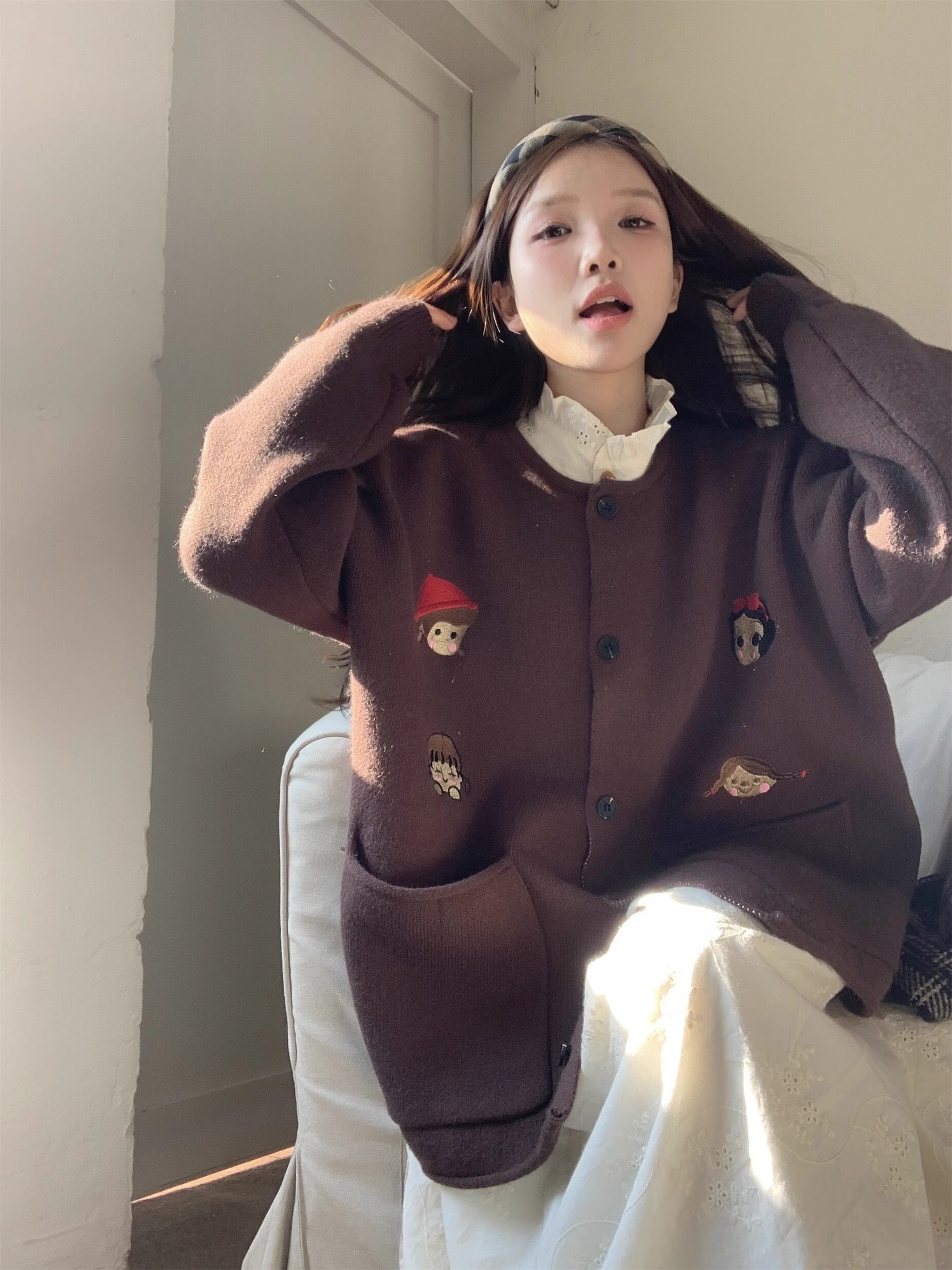 レディース トップス ジャケット ニット セーター カーディガン 丈長 長袖 萌袖 ラウンドネック 襟なし ワイド オーバーサイズ 刺繍 前開き ボタン 中厚手 ニット 大人可愛い ガーリー 抜け感 無地 秋 冬