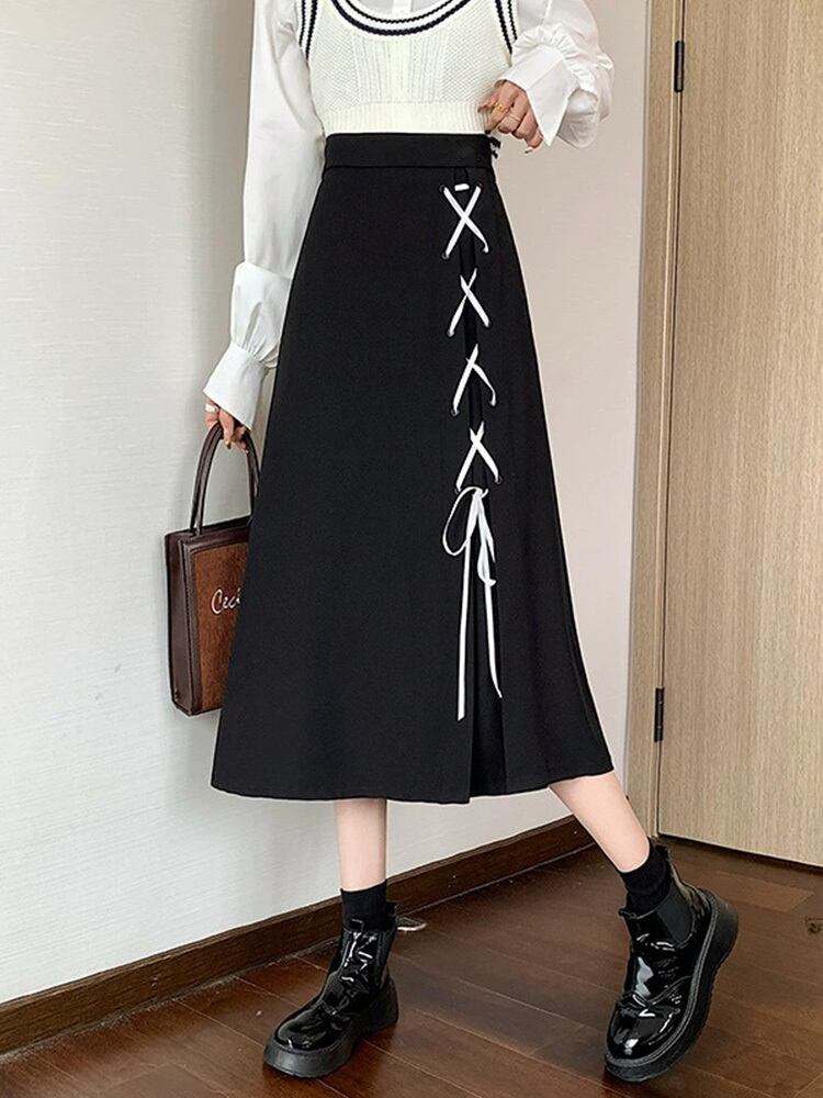 レディース スカート フレア ロング フレア リボン ハイウエスト かわいい シンプル ガーリー 無地 春 夏 デート お出かけ 休日 ショッピング モノトーン 韓国 体型カバー 脚長 着回し ブラック