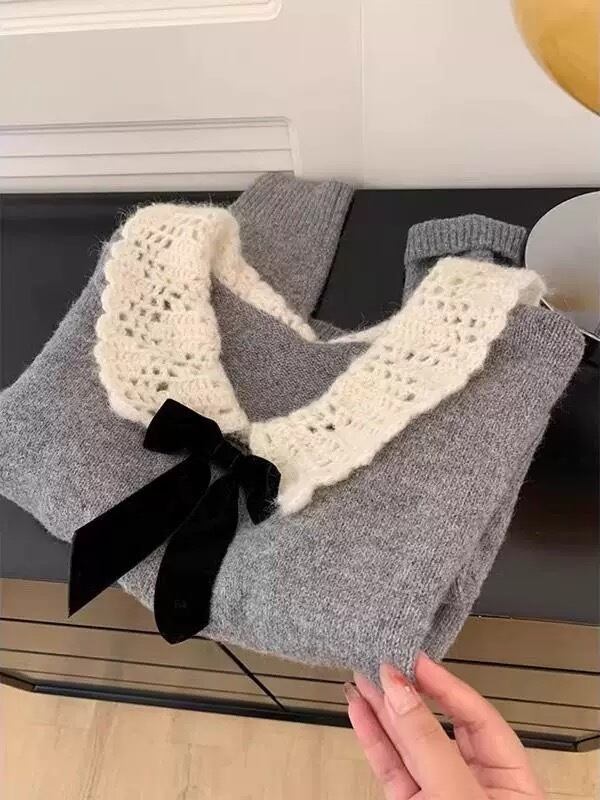レディース トップス ニット セーター ショート 長袖 萌袖 Uネック 襟付き りぼんタイ ワイド レース リボン 大人可愛い 上品 おしゃれ キュート 無地 春 秋 冬 学生 学校 デート お出かけ