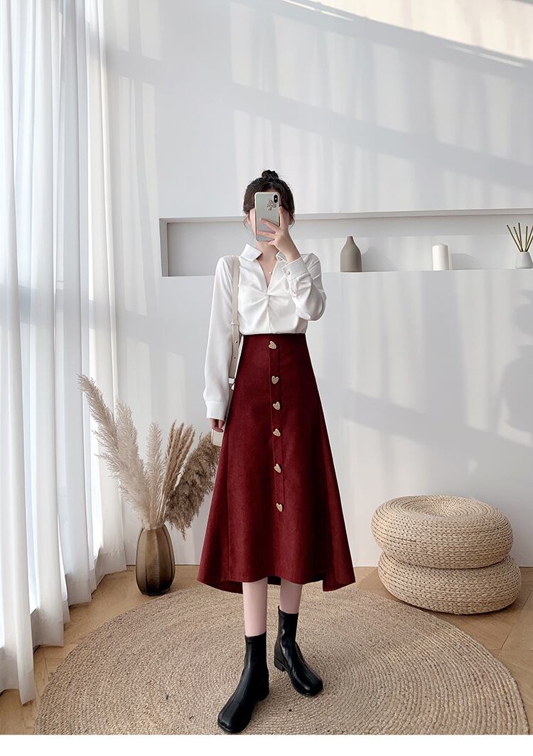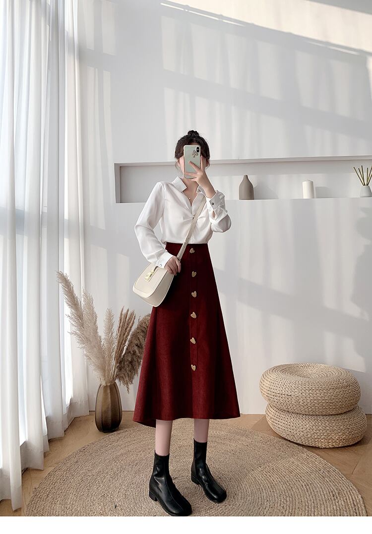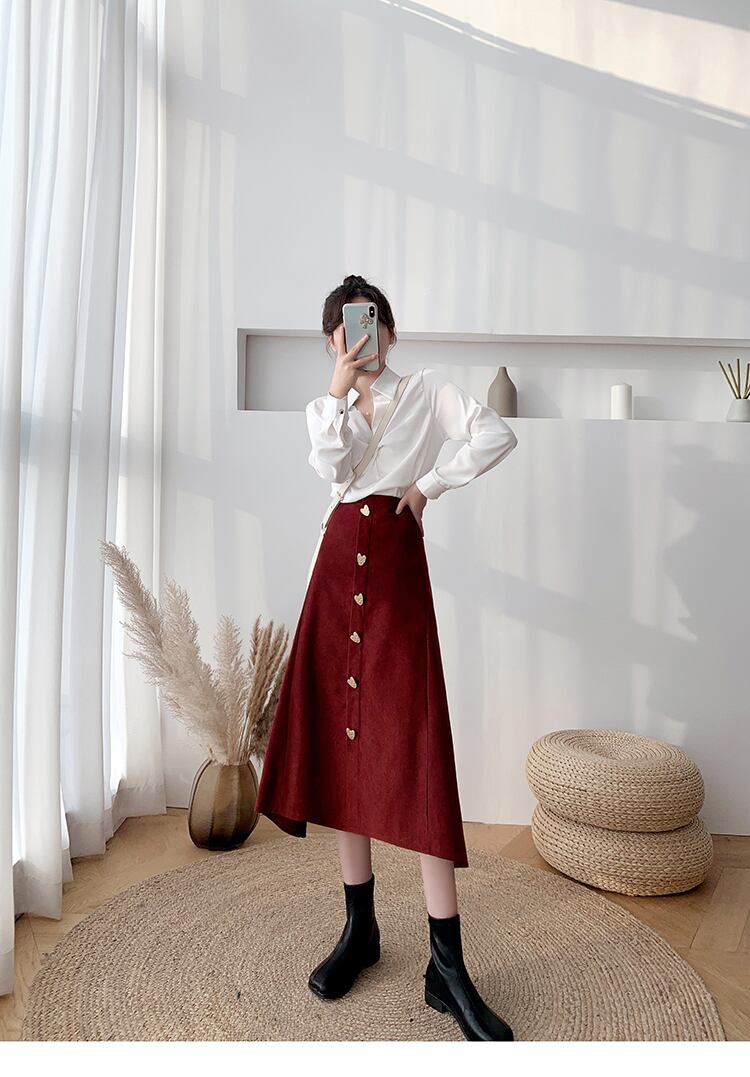 美脚効果抜群のハイウエストデザインに、女性らしいAラインシルエットが上品なロングスカート。歩くたびに揺れるフィッシュテールが、あなたの魅力を引き立てます。フロントのハート型飾りボタンが、ちょっぴり甘くて可愛らしいアクセントに。秋冬にぴったりの温かみのある素材で、デートやお出かけにぴったり。お友達とのペアコーデもおすすめです。黒とワインレッドの2色展開で、あなたのスタイルに合わせて選んで。美脚効果も抜群で、自信を持って履ける一着です。