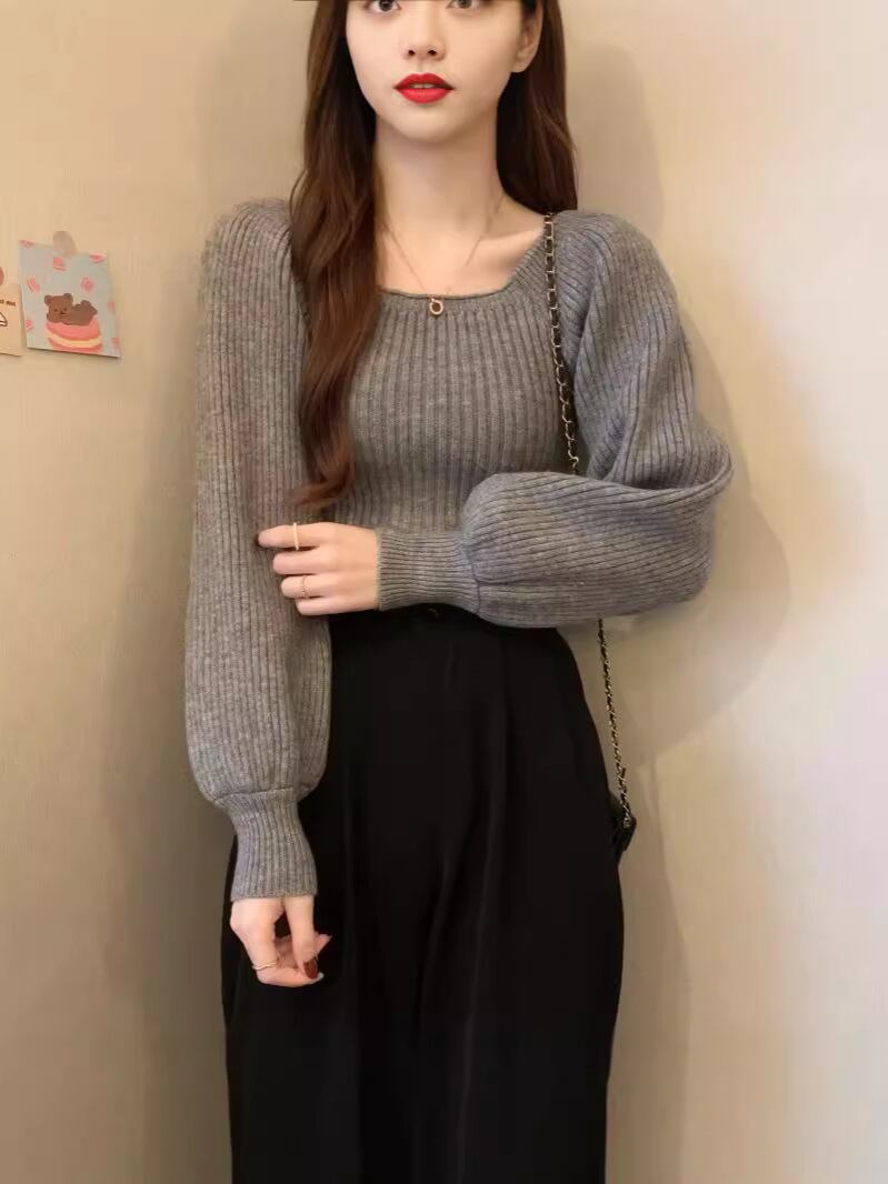 レディース トップス ニット 長袖 パフスリーブ 萌袖 スクエアネック スリム 細身 フェミニン リブ かわいい 大人可愛い きれいめ シンプル カジュアル 上品 こなれ感 ラフ 抜け感 ナチュラル 無地 春 秋 通勤 お出かけ 普段使い 着回し 定番