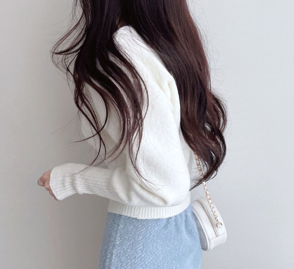 レディース トップス ニット カーディガン ショート 長袖 パフスリーブ 萌袖 Vネック スリム 細身 フェミニン 前開き ボタン 大人可愛い きれいめ 上品 おしゃれ こなれ感 抜け感 春 秋 OL 通勤 学生 お出かけ 重ね着 体型カバー 普段使い 着回し