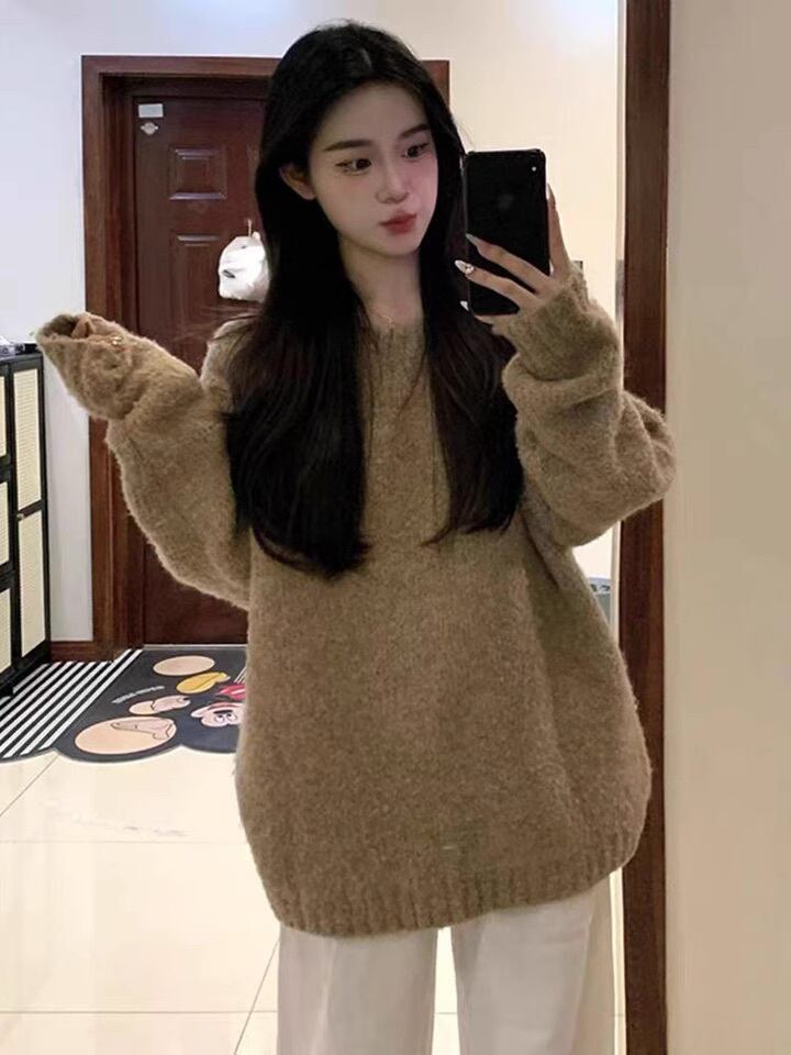 レディース トップス ニット セーター 長袖 Uネック 中厚手 シンプル カジュアル エキゾチック ラフ 無地 秋 冬 デート お出かけ 休日 ビッグ ゆったり カーキ