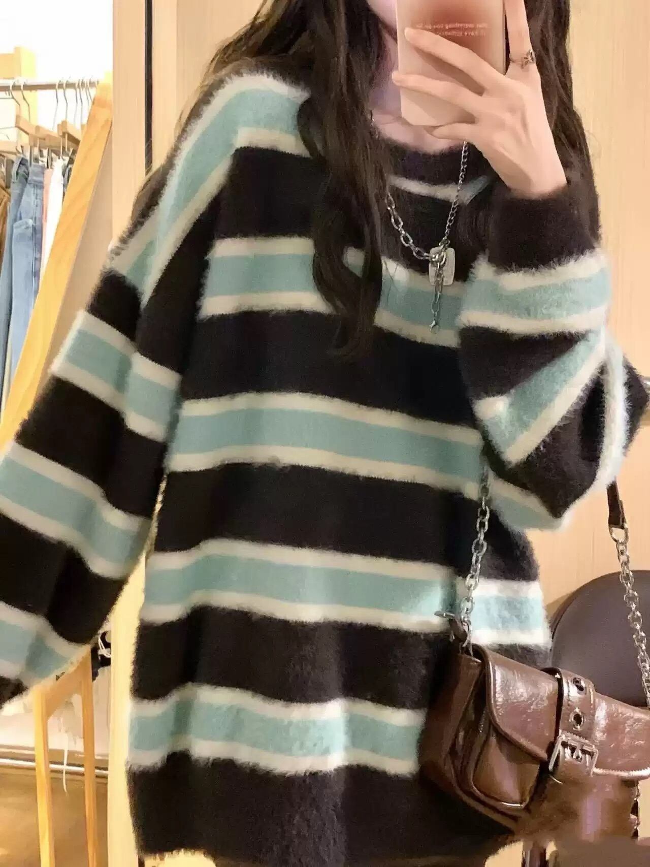 レディース トップス ニット セーター 長袖 Uネック ふわふわ 中厚手 大人可愛い クール モード系 モダン ボーダー 秋 冬 デート お出かけ 休日 ゆったり ゆる