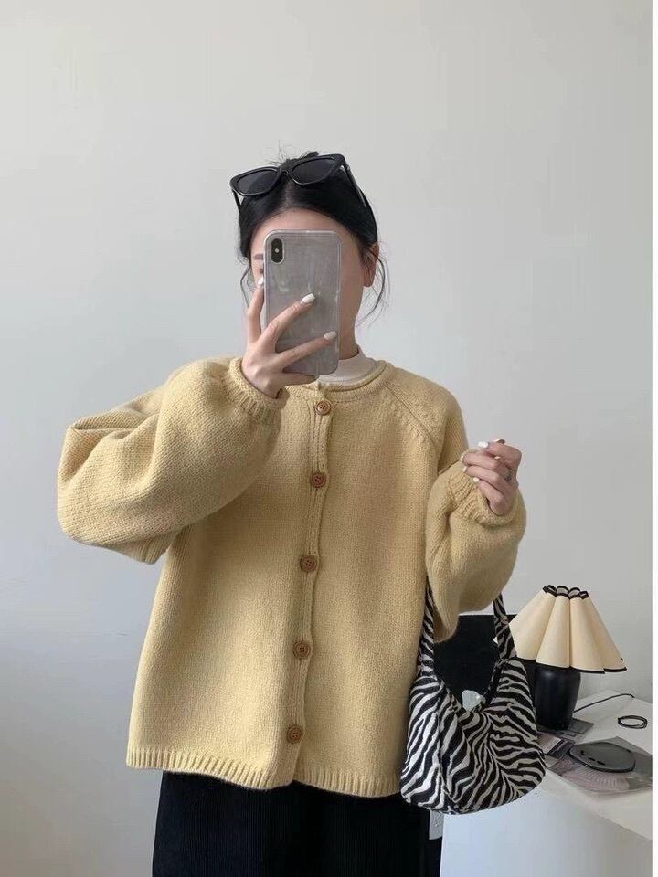 レディース トップス ニット セーター カーディガン 長袖 バルーン袖 ラウンドネック ボタン シンプル カジュアル レトロ 無地 春 秋 暖かい 防寒 普段使い イエロー
