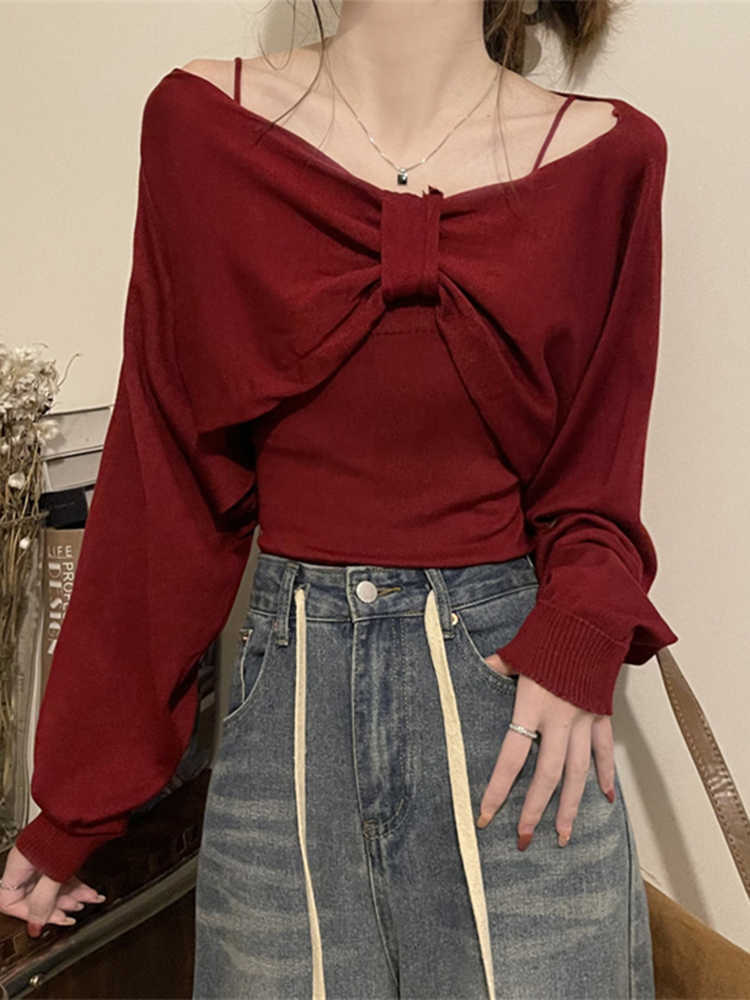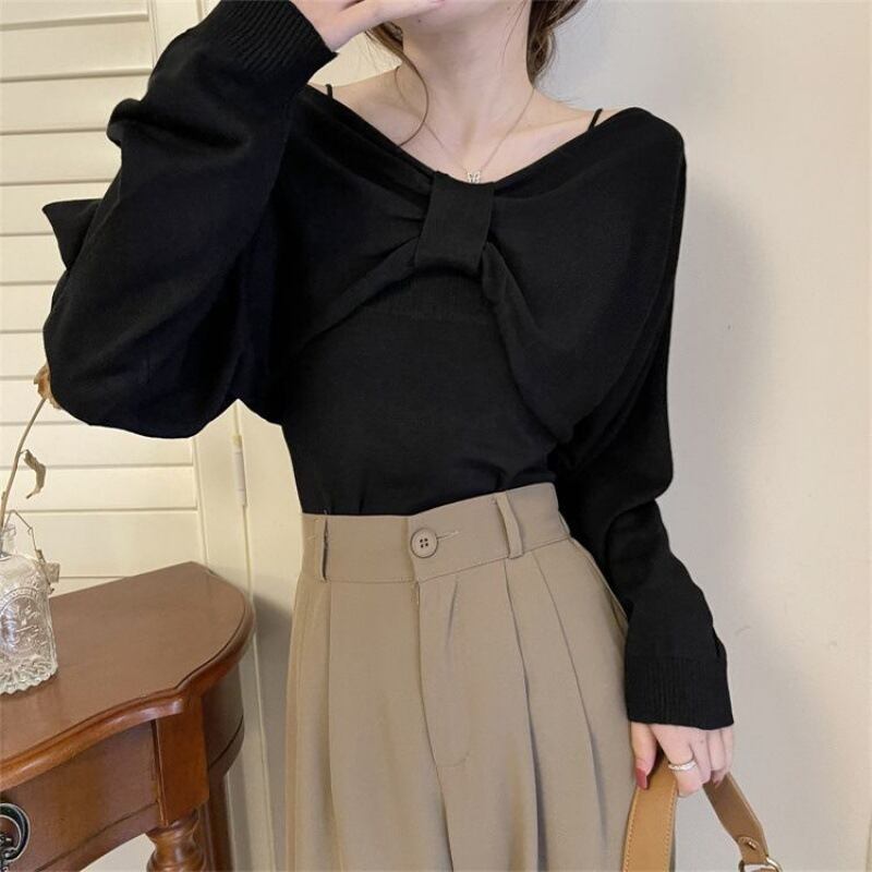 フェミニンでおしゃれな女性のためのニット+キャミソールのセットです!ワンショルダーとリボンデザインが特徴で、可愛らしい雰囲気を引き立てます。タックデザインが施されており、よりエレガントな印象を与えます。春秋の通勤やデート、お出かけ、女子会のシーンで大活躍するトップスです。とろみ感があり、心地よい着心地を提供します。