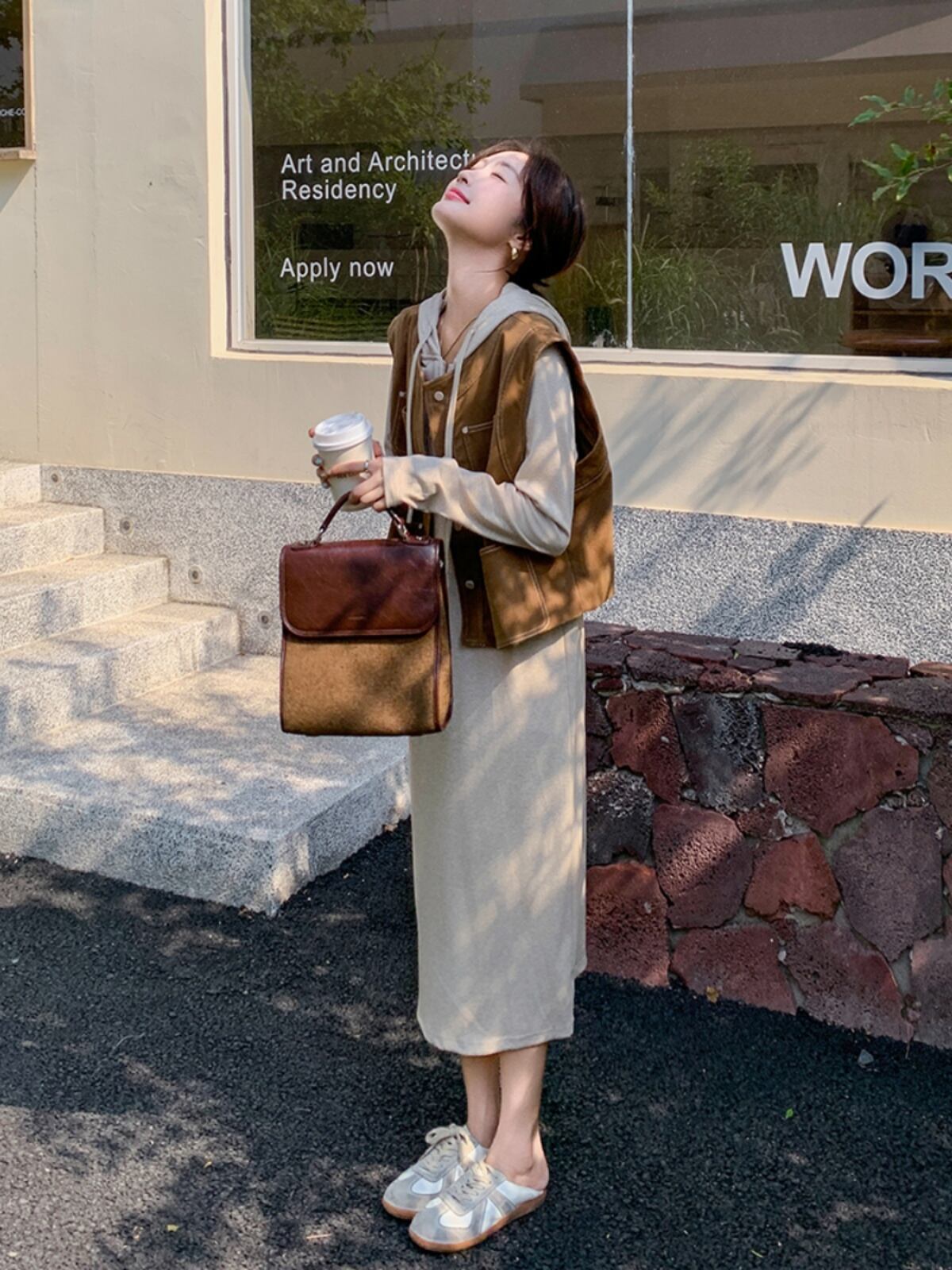 大人のラフスタイルにぴったりのベスト&ワンピースの2点セット。ベストと長袖ロングワンピースは、フード付きでカジュアルながら洗練された雰囲気を演出します。Aラインのシルエットが体型を美しくカバーし、ゆったりとした着心地が魅力。無地のシンプルデザインで、普段使いからお出かけまで幅広いシーンで活躍。ポケット付きで実用性も抜群な、こなれ感あるアイテムです。