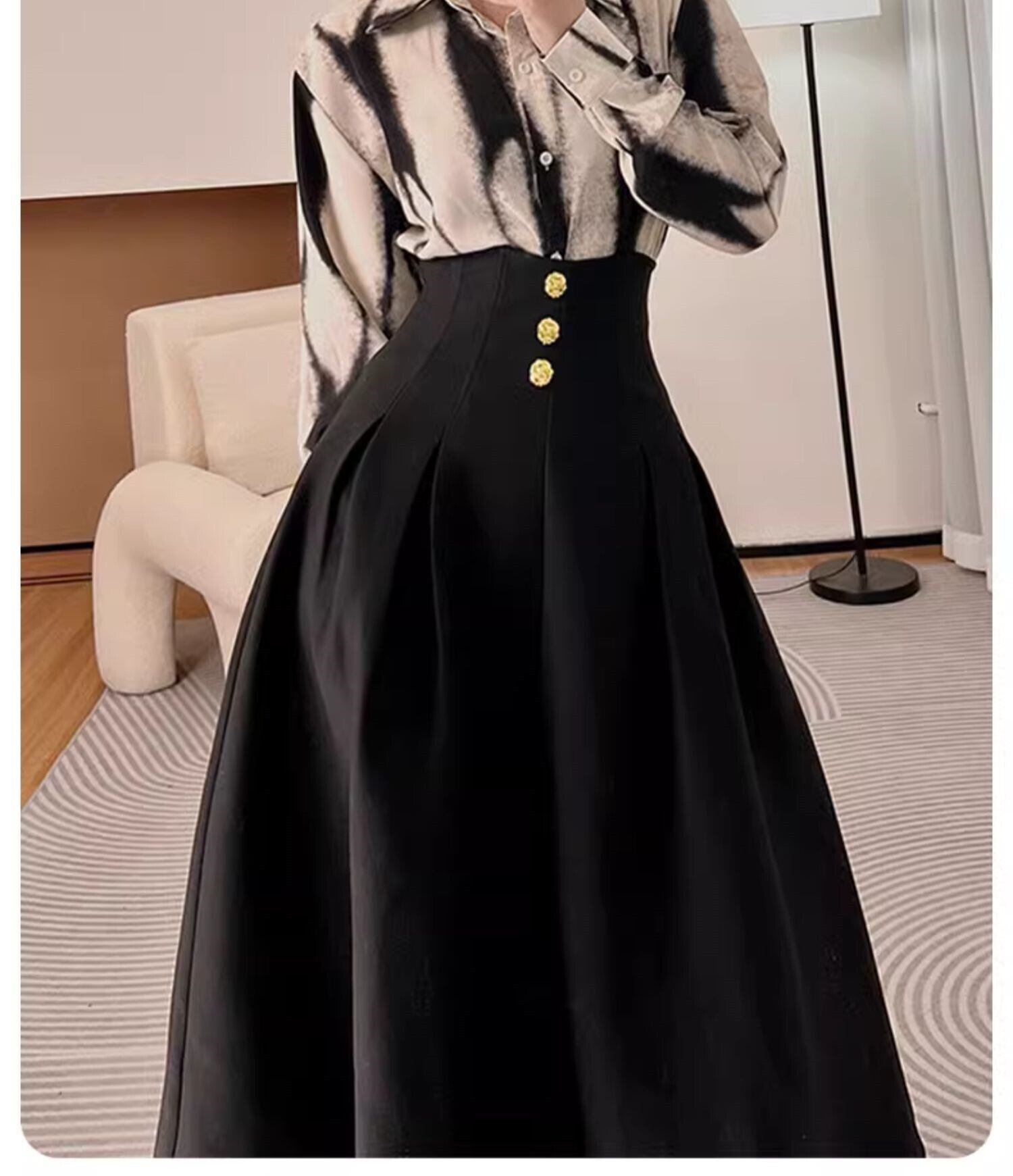 ウエストにはゴムがあり楽ちんなのに、タックとハイウエストで美シルエットを叶えるロングスカートです。上品なAラインシルエットが、女性らしさを引き立て、どんなトップスとも好相性。金ボタンのデザインがアクセントになり、カジュアルすぎないのが嬉しいポイント。デートやお出かけなど、様々なシーンで活躍間違いなしの一枚です。オールシーズン着用でき、着回し力も抜群ですよ。