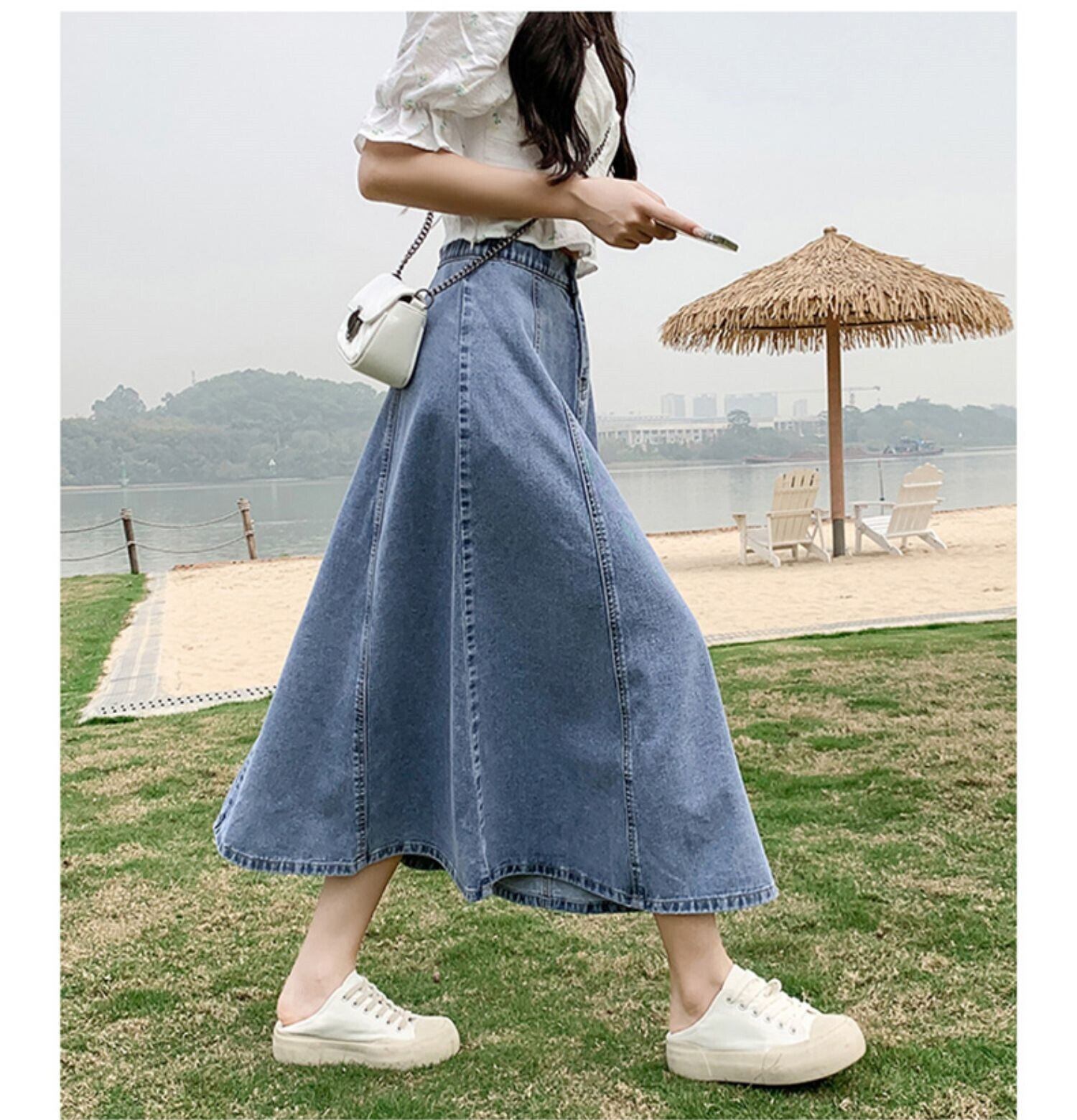 レディース スカート デニム ミモレ ロング Aライン ハイウエスト ウエストゴム ブルーデニム 大人可愛い シンプル カジュアル ラフ オールシーズン デート お出かけ アウトドア イベント 脚長 普段使い 着回し