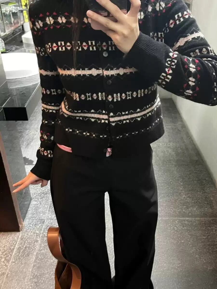 レディース トップス ニット カーディガン セーター 長袖 ラウンドネック スリム 編み込み 異国風 ボタン 大人可愛い カジュアル アジアン エキゾチック 総柄 秋 冬 デート お出かけ 休日